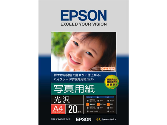【仕様】●サイズ:A4●紙厚:0.27mm●白色度:92%●坪量:255g/m2●注文単位(入数):1冊(20枚)●長時間色あせにくい高品質な写真をプリントできる。 【検索用キーワード】EPSON インクジェット用紙 光沢タイプ 光沢紙インクジェット用紙 印画紙 A4用紙 E01339 エプソン 写真用紙〈光沢〉 A4 20枚 KA420PSKR 2,107 ~