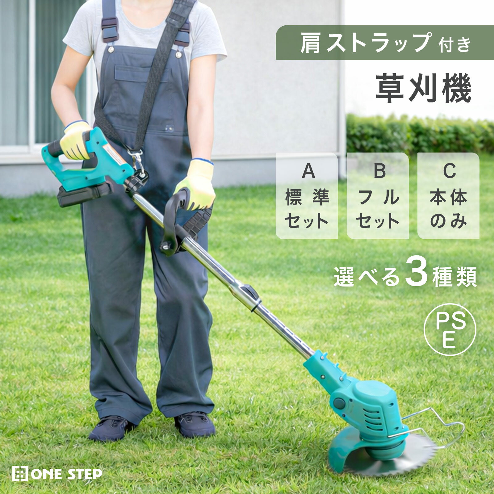 手持ちの草刈り機が重い、金属刃の取り扱いが怖い、 飛び石や飛び跳ねが激しい、コードタイプなので操作がつらい…… その悩みはONE STEPの草刈り機で解決! 【伸縮自在で持ち運びラクラク!】 約114?140cmの長さに伸縮可能なので、 身長に合わせて腰や足に負担が掛からないように調整できます。 縮小するすれば車での持ち運びも便利、倉庫への収納にも邪魔になりません。 場所や用途に合わせてヘッド部分の角度も調整が可能です! 【リチウムイオンバッテリー搭載※Aセット・Bセットのみ】 約78分の連続運転が可能。 広範囲の刈り込みにも活躍!気が向いた時、待たずに使えます。 【両面しっかり使い込める替え刃付き】 チップソー・スチールブレード・ナイロン製ブレード・ナイロンコードカッター 4種類の替刃が同梱されています! 使用用途や場所、刈り取る草の種類に合わせてご活用ください。 ナイロンコードカッターは壁や庭木などの障害物を傷つけず、雑草だけを刈り取ります。 【軽量設計で作業がラクラク】 枝の剪定、雑草や芝生のお手入れにぴったりの軽量設計のコードレス草刈り機です。 軽いので腕が疲れにくく、女性やご高齢の方でも作業が楽に進みます。 【ヘッド部分は角度調整が可能】 角度はヘッド部分の角度ボタンを押すと、4段階に調節できます。 地面や垣根など、用途に合わせて変えられるので作業がはかどります。 ※Aセット・Bセットに保護カバーが付属しています。 作業中の飛散による ケガ対策としてにご活用ください。 【誤操作を防ぐ設計】 安全スイッチとスタートスイッチをONにして動作します。 安全スイッチとスタートスイッチの片方をONにしても 動作しないので、誤操作によるトラブルを防ぎます。 充電式 コードレス 草刈り機 バッテリー付き 角度調整 替刃付き 枝切り 芝生庭 畑 雑草 草 植木 刈払機 伸縮 長さ114?140cm 手持ちの草刈り機が重い、金属刃の取り扱いが怖い、 飛び石や飛び跳ねが激しい、コードタイプなので操作がつらい…… その悩みはONE STEPの草刈り機で解決! セット一覧 セット毎に付属する内容が異なります。 Aセット(標準セット) 本体×1、バッテリー(2000mAh)×2、充電器×1 ナイロンコードカッター×2、ナイロン製ブレード×5 スチールブレード×2、チップソー×1 フロントガ一ド×1、飛散防止カバー×1 補助ハンドル×1、ストラップ×1、ゴーグル×1、手袋×1 Bセット(フルセット) 本体×1、バッテリー(2000mAh)×2、充電器×1 ナイロンコードカッター×5、ナイロン製ブレード×10 スチールブレード×5、チップソー×3 フロントガ一ド×1、飛散防止カバー×1 補助ハンドル×1、ストラップ×1、ゴーグル×1 手袋×1、補助輪×1 Cセット(本体のみ) 本体×1、ナイロンコードカッター×2、ナイロン製ブレード×5 スチールブレード×2、チップソー×1 フロントガ一ド×1、飛散防止カバー×1 補助ハンドル×1、ストラップ×1、ゴーグル×1、手袋×1 ※バッテリーは付属しておりません。 ※別途で21Vリチウムイオンバッテリーをご用意する必要がございます。 商品詳細※本体のサイズは全セット共通です。 1年保証付き 【★P3倍&1,000円cp!】充電式 コードレス 草刈り機 角度調整 替刃付き 枝切り 芝生庭 畑 雑草 草 植木 刈払機 伸縮 長さ114〜140cm 4,150 ~