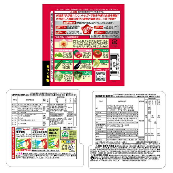 商品の特徴 住友化学園芸 ベニカXネクストスプレー1000ml 園芸薬品 スプレー 病害虫対策 希釈不要 ●花、庭木、野菜(トマト・きゅうり・なす・キャベツ・レタス・リーフレタス・メロン)など幅広い植物に使える、化学防除成分と物理防除成分を組み合わせた殺虫殺菌スプレーです ●害虫に素早く、長く(アブラムシ1ヵ月)効き、退治の難しいチョウ目老齢幼虫(ハスモンヨトウ、オオタバコガ)、薬剤抵抗性害虫(アブラムシ、ハダニ)にも効き、病気の予防・治療に効果的です ●新提案!手が疲れにくいトリガーで散布作業の負担を軽減!●世界初!※5種類の成分で植物の病害虫をしっかり防除!●還元澱粉糖化物…薬剤抵抗性の発達したアブラムシ、ハダニにも効く! ●クロチアニジン…雨に強い浸透移行性 殺虫効果が持続!●ペルメトリン…ノックダウン効果 害虫をすばやく退治!●ピリダリル…ハスモンヨトウなどの大型幼虫に効く!●マンデストロビン…雨に強い浸透移行性 病気の予防・治療!●※農林水産省に農薬登録された家庭園芸用殺虫殺菌スプレーにおいて(2019年2月時点) 製品仕様 ●内容量:1000ml JANコード:4975292603832 住友化学園芸 ベニカXネクストスプレー1000ml 園芸薬品 スプレー 病害虫対策 希釈不要 [4975292603832] 1,436 ~