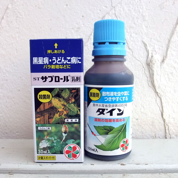 殺菌剤:サプロール乳剤30mlと展着剤:ダイン100mlのセット殺菌剤のサプロール乳剤30ミリリットル入りと薬の付きをよくする展着剤ダイン100ミリリットル入りのセットです。 セット内容:・殺菌剤:サプロール乳剤30ミリリットル入りうどん粉病と黒星(黒点)病、さび病の専門薬です。 特にバラの黒星病には優れた効果をがあります。 散布後の葉の汚れも少なく、観賞価値を損ないません。 葉の中に成分が浸透し、予防と治療の効果を発揮します。 バラの栽培の必需品です。 使用方法:800〜2000倍以上に希釈して散布してください。 希釈液に少量の展着剤(ダインなど)を加えるとより効果的です。 計量スポイトつき。 30ミリリットル入り。 主要成分:トリホリン・展着剤:ダイン100ミリリットル入り殺虫剤や殺菌剤などの散布液を虫や葉につきやすくする薬剤。 薬剤を希釈する際、均一に混ざりやすくします。 100ミリリットル入り。 この薬剤の適用一覧及び使用法についてはKINCHO園芸(旧住友化学園芸)のホームページをご参照ください。 ■この商品は液体のため、沖縄までのお届けはできません。 お届け先が沖縄県の場合、キャンセルさせていただきますので、ご了承ください。 殺菌剤:サプロール乳剤30mlと展着剤:ダイン100mlのセットの栽培ガイド3月のバラのお手入れ5月のバラのお手入れ殺虫剤の適用一覧薬剤の散布液の作り方 殺菌剤:サプロール乳剤30mlと展着剤:ダイン100mlのセット 1,673 ~