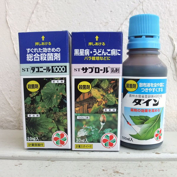 殺菌剤:サプロール乳剤30ml・STダコニール1000 30ml・展着剤ダイン100mlの3点セット殺菌剤「サプロール乳剤30ミリリットル入り」と長期間防除効果のある殺菌剤「STダコニール1000 30ミリリットル入り」、そして薬の付きをよくする展着剤「ダイン100ミリリットル入り」の3点セット。 ロングセラー商品です。 バラ黒点病予防用には特におすすめです。 セット内容:・殺菌剤:サプロール乳剤30ミリリットル(草花・花木のうどん粉、黒点、さび病) ×1・総合殺菌剤:STダコニール1000 30ミリリットル入り(花・野菜・芝用) ×1・展着剤:ダイン100ミリリットル入り×1・殺菌剤:サプロール乳剤30ミリリットル(草花・花木のうどん粉、黒点、さび病) うどん粉病と黒星(黒点)病、さび病の専門薬です。 特にバラの黒星病には優れた効果をがあります。 散布後の葉の汚れも少なく、観賞価値を損ないません。 葉の中に成分が浸透し、予防と治療の効果を発揮します。 バラの栽培の必需品です。 使用方法:800〜2000倍以上に希釈して散布してください。 希釈液に少量の展着剤(ダインなど)を加えるとより効果的です。 成分:トリホリン容量:30ミリリットル入りKINCHO園芸(旧住友化学園芸)社製剤型・使用方法乳剤 : 水でうすめて散布効果のある病気うどんこ病、さび病、黒星病、フェアリーリング病、灰星病、白さび病、葉かび病対象作物[草花]きく、芝[野菜]トマト、なす、ピーマン、きゅうり、メロン、いちご、さやえんどう、ねぎ、食用ぎく[花木・庭木]ばら[果樹]もも、かき、りんご[特用作物]たばここの薬剤の適用一覧及び使用法についてはKINCHO園芸(旧住友化学園芸)のホームページをご参照ください。 ・総合殺菌剤:STダコニール1000 30ミリリットル入り(花・野菜・芝用) 植物の病気の発病前から発病初期に散布し、植物を病気から守る効果をもつ殺菌剤です。 うどんこ病、黒星病、炭そ病、褐斑病、斑点病、灰色かび病、もち病、芝生(ベントグラス、バミューダグラス)のブラウンパッチ病、苗立枯病など、広範囲の病気に防除効果をあらわします。 草花、野菜、お茶、稲、果樹などさまざまな植物に利用できます。 長期間にわたって病気から植物を守る残効性にすぐれ、薬害も殆どありません。 計量も手軽にでき、散布後の汚れも少ない薬剤です。 成分:TPN容量:30ミリリットル入りKINCHO園芸(旧住友化学園芸)社製剤型・使用方法フロアブル剤 : 水でうすめて散布効果のある害虫・病気うどんこ病、立枯病、斑点性の病気(疫病、つる枯病、ごま色斑点病、べと病、黄斑病、夏疫病、褐色斑点病、褐斑病、黒枯病、黒星病、白星病、白カビ斑点病、黒斑病、黒点病、炭そ病、白斑病、斑点病、斑点病(株枯症)、斑点落葉病、葉枯病、円斑病、輪斑病、輪紋病)、もち病、灰色かび病、苗立枯病、すずかび病、すそ枯病、ヘルミントスポリウム葉枯病、モニリア病、果実軟腐病、灰星病、褐色円星病、茎枯病、黒葉枯病、黒葉腐病、小菌核腐敗病、新梢枯死症、白さび病、網もち病、紋枯病、葉かび病、葉枯病、葉渋病、葉腐病(ブラウンパッチ)、ワッカ症、ビッグベイン病、ステムフィリウム葉枯症、根こぶ病対象作物[花き]ばら、きく、ゆり、チューリップ、宿根アスター、カーネーション、りんどう、芝[野菜]トマト、ミニトマト、きゅうり、なす、ズッキーニ、ピーマン、かぼちゃ、すいか、メロン、にがうり、うり類(漬物用、ただし、ゆうがおを除く)、ゆうがお、なばな類(なばなを除く)、なばな、 ひろしまな、キャベツ、はくさい、ブロッコリー、だいこん、にんじん、セルリー、レタス、リーフレタス、しそ、みずな、みつば、アスパラガス、わけぎ、たまねぎ、ねぎ、らっきょう、らっかせい、みょうが(花穂、茎葉)、にんにく、ばれいしょ、しょうが、やまのいも、やまのいも(むかご)、てんさい、食用ぎく、食用ゆり、うど、ふき、稲、みしまさいこ、もりあざみ、しゃくやく(薬用)[果樹]もも、ネクタリン、いちじく、りんご、なし、かりん、マルメロ、キウイフルーツ、パッションフルーツ、パパイヤ[特用作物]茶、たばこ使用に際しては必ず商品の説明をよく読んで、希釈倍率を守って散布してください。 この薬剤の適用一覧及び使用法についてはKINCHO園芸(旧住友化学園芸)のホームページをご参照ください。 ・展着剤:ダイン100ミリリットル入り展着剤は散布薬剤を虫や葉につきやすくする薬剤。 散布した薬剤が植物や病害虫にむらなく付着するので薬剤の効果が高まり、雨露による流亡も軽減します。 ほとんどの農薬と混用可能です。 散布液1L当たり0.1〜0.3ミリリットルと、極少量加えるだけで効果があります。 使用方法散布液1リットル当たり0.1〜0.3ミリリットル程度、加えてご使用下さい。 ※1滴で約0.03mlです。 有効成分:ポリオキシエチレンノニルフェニルエーテル、リグニンスルホン酸カルシウム容量:100ミリリットル入りKINCHO園芸(旧住友化学園芸)社製剤型・使用方法液剤 : 散布液に加えて使用この薬剤の適用一覧及び使用法について