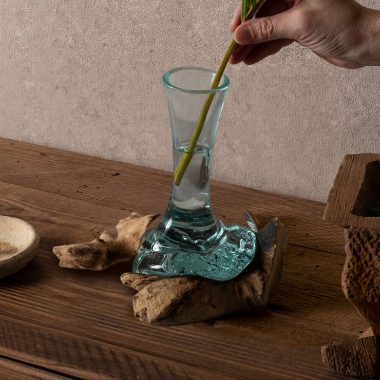 ■サイズ(cm) 約 W 20 × D 15 × H 20 ※個体差の大きい商品です。 サイズは上記記載サイズの+-3?4cm程度のものもございます。 予めご了承ください。 ■重量 約 1 kg ■素材 ガラス、古木 ■生産国 インドネシア ■備考 水使用可 ■お手入れ ガラス部分 ・水洗いが可能です。 使用後は中の水を捨て、柔らかい布で水分を拭き取ってください。 ・汚れが気になる場合は、中性洗剤を薄めてやさしく洗い、洗剤成分が残らないよう十分にすすいでください。 ・研磨剤入りスポンジや硬いブラシの使用は、キズの原因となるため避けてください。 古木部分 ・水洗いは避け、乾いた布または固く絞った布で軽く拭いてください。 ・長時間水に濡れた状態が続くと、シミや劣化の原因となるためご注意ください。 ・直射日光や高温多湿な場所での長期設置は、反りや割れの原因となる場合があります。 ■ご注意 ※本商品は古木および手作業で成形したバリガラスを使用しているため、形状・色味・厚み・気泡・歪みなどに個体差があります。 ※木部にはヒビ、欠け、節、凹凸、色ムラが見られる場合がありますが、素材の特性としてご理解ください。 ※天然の木そのものの形を活かしているため、サイズ・形が写真と異なる場合があります。 ※商品の形やサイズはお選びいただけません。 ※木の形に合わせてガラスを吹きつけておりますが、完全な安定感がある商品ではございません。 商品によって多少のグラつきが出る場合がございますので予めご了承ください。 ※木にガラスを吹きつけた後の黒く焦げ付いた跡がございますが、これは製造工程上出来るものです。 ※ガラスの底にザラつきがございますので、お取り扱いにご注意ください。 ※リサイクルガラスを使用しておりますので、色味に多少の個体差があります。 ※ガラス部分は強い衝撃を与えると破損する恐れがあります。 取り扱いには十分ご注意ください。 ※木部は水に弱いため、水洗いは避け、濡れた場合は速やかに拭き取ってください。 ※直射日光、高温多湿、エアコンの風が直接当たる場所での長時間使用は、木部の反りや割れ、劣化の原因となる場合があります。 ※安定した平らな場所に設置し、転倒の恐れがある場所での使用はお控えください。 ※ハンドメイドのためサイズ・形・色合い・デザインには個体差がございます。 ※モニターの種類やパソコンの環境により、実際の商品のお色と若干異なる場合がございます。 類似商品はこちら花瓶 一輪挿し おしゃれ フラワーベース 約43,520円花瓶 ガラス フラワーベース おしゃれ 一輪挿1,780円花瓶 一輪挿し おしゃれ フラワーベース 約32,970円花瓶 一輪挿し おしゃれ フラワーベース 約12,200円一輪挿し フラワーベース 木製 マンゴー ウッ990円一輪挿し フラワーベース 木製 マンゴー ウッ690円フラワーベース 花瓶 花びん 造花 フェイク 7,900円ラタン 花瓶 陶器 フラワーベース 枝物 ベー6,800円フラワーベース ガラス ブルー グラデーション1,156円新着商品はこちら2026/3/11ウッド スツール 木製 おしゃれ 椅子 玄関 33,000円2026/3/7滑り止めシート キッチン ラグ ズレ防止 洗え280円?2026/3/7グラス 割れない 強化ガラス 355ml 薄口1,200円?再販商品はこちら2026/3/11ゴミ箱 ごみ箱 ダストボックス 四角 長方形 2,680円2026/3/11サイドテーブル 大理石 丸 木製 スワールウッ22,000円2026/3/10ラグ ラグマット ウィルトン織 ジオメトリック21,500円2026/03/11 更新 古木とガラスの異素材を組み合わせた一輪挿しタイプのフラワーベース 天然素材ならではの力強さを感じる古木と、透明感のあるガラスを組み合わせた、一輪挿しタイプのフラワーベース。 古木の上に溶融ガラスを流し込んで成形することで、木の凹凸や木目の流れに沿った、不定形で有機的な表情が生まれます。 計算されすぎないフォルムと、手仕事ならではの揺らぎが、空間に静かな奥行きと温もりをもたらします。 最大の特徴は、古木の個性をそのまま活かした一点物ならではの佇まい。 一輪の花を生けるだけで、花だけでなく器そのものも主役となり、量産品にはない存在感で空間を印象づけます。 ナチュラルなインテリアはもちろん、無機質になりがちなモダンやインダストリアルな空間にも、ほどよいやわらかさと表情をプラスします。 また、省スペースで取り入れやすい一輪挿しサイズで、棚やサイドボード、窓辺などにも気軽に設置可能。 花を生けない状態でもオブジェとして成立し、素材そのものを楽しむディスプレイとして活躍します。 自然素材と手仕事の魅力を、日常の中でさりげなく取り入れたい方におすすめのアイテムです。 おすすめポイント ・古木とガラスの異素材を組み合わせた、存在感のあるデザイン ・古木の形状に合わせてガラスを成形した、一点物ならではの表情 ・花を生けなくてもオブジェとして成立する佇まい ・省スペースに置きやすい、小ぶりな一輪挿しサイズ ・ナチュラルから和モダン、インダストリアルまで幅広く対応 商品概要 サイ