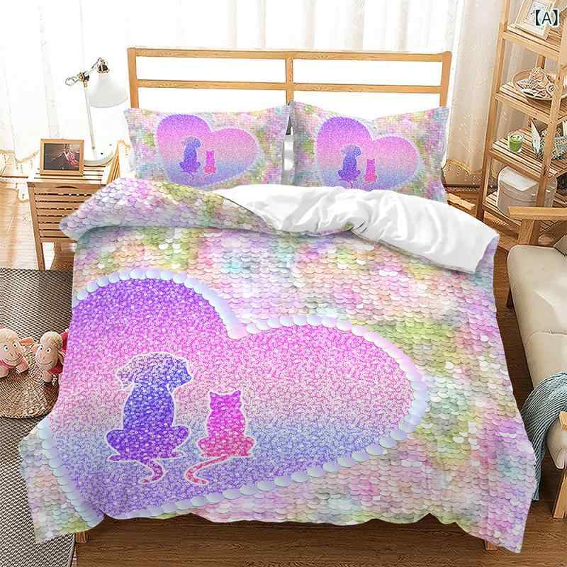 ・印染方法: デジタルプリント・織り方: 起毛・カラー: 花柄・主な素材: 化学繊維・スタイル: ベッドカバー式・デザイン: カートゥーン・対応ベッドサイズ: 1.5mベッド・サイズ展開: 135x200cm(2点セット), 140x210cm(2点セット), 173x228cm(2点セット), 155x220cm(3点セット), 180x210cm(3点セット), 200x200cm(3点セット), 200x229cm(3点セット), 210x210cm(3点セット), 210x245cm(3点セット), 220x230cm(3点セット), 220x260cm(3点セット), 229x229cm(3点セット), 229x264cm(3点セット), 240x260cm(3点セット) 寝具カバー3点セット グラデーション ラメ 3Dデジタルプリント ポリエステル ピーチスキン 掛け布団カバー シーツ 枕カバー 5,488 ~