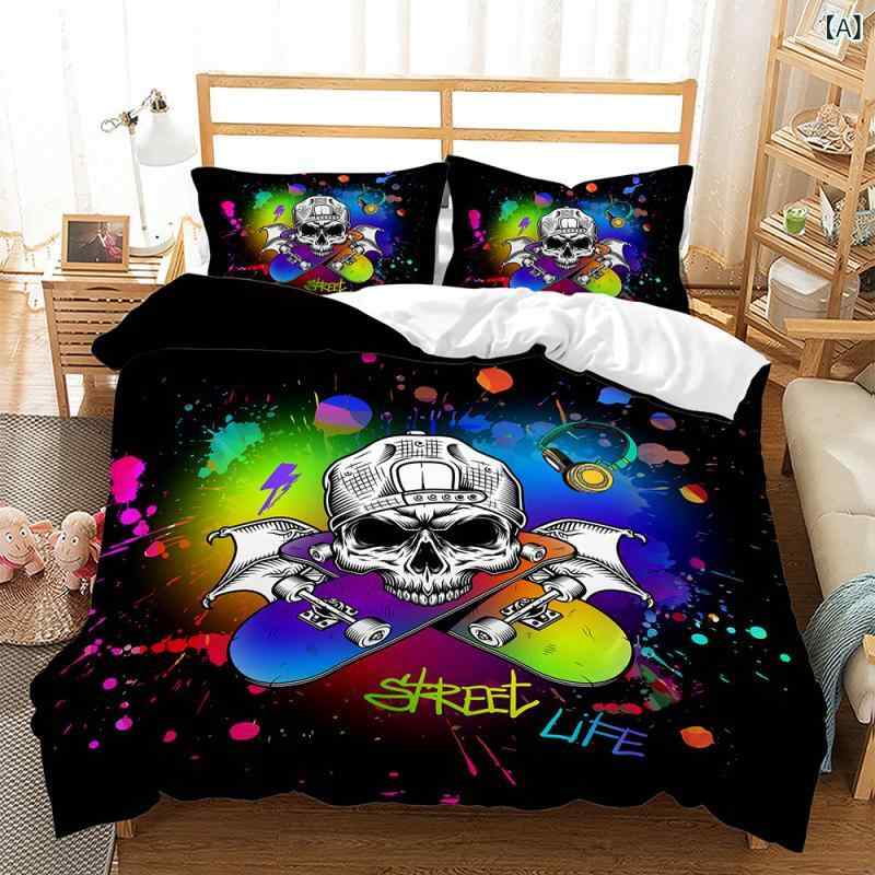 ・印染工法: デジタルプリント・織り方: ピーチスキン加工・カラー: マルチカラー・主な素材: 化学繊維・スタイル: ベッドスプレッドタイプ・テイスト: カートゥーン・対応ベッドサイズ: 1.5mベッド用・カテゴリ: 寝具セット・セット内容: 2点セット、3点セット・サイズ展開: 135x200cm, 140x210cm, 173x228cm, 155x220cm, 180x210cm, 200x200cm, 200x229cm, 210x210cm, 210x245cm, 220x230cm, 220x260cm, 229x229cm, 229x264cm, 235x260cm 布団カバー スカル 骸骨 3Dデジタルプリント ポリエステル 起毛加工 3点セット 洗える 速乾性 肌触りやわらか ベッドルーム 寝室 普段使い 個性的 デザイン 寝具カバー 5,488 ~