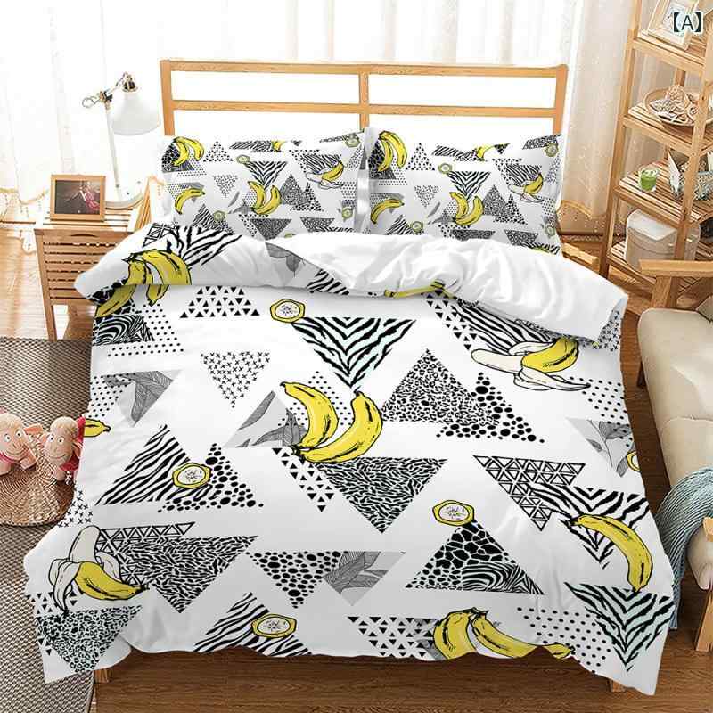 ・プリント加工: デジタルプリント・織り加工: 起毛加工・カラー: マルチカラー・素材: 化繊100%・スタイル: ベッドカバータイプ・デザイン: キャラクター・対応ベッドサイズ: 1.5m幅・サイズ展開: 135x200cm (2点セット)、140x210cm (2点セット)、173x228cm (2点セット)、155x220cm (3点セット)、180x210cm (3点セット)、200x200cm (3点セット)、200x229cm (3点セット)、210x210cm (3点セット)、210x245cm (3点セット)、220x230cm (3点セット)、220x260cm (3点セット)、229x229cm (3点セット)、229x264cm (3点セット) 布団カバー 3点セット 寝具 ベッドリネン フルーツ柄 パイナップル バナナ 3Dデジタルプリント 立体感 ポリエステル ピーチスキン加工 かわいい おしゃれ 5,488 ~