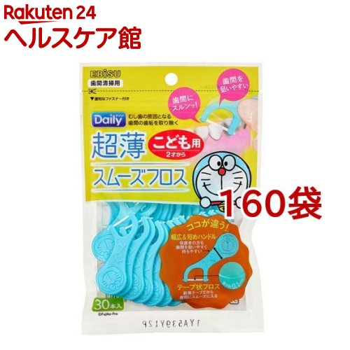 お店TOP>ベビー&キッズ>ベビーケア・バス用品>オーラルケア用品(子供用)>子供用デンタルフロス>デイリー 超薄スムーズフロス アイムドラえもん こども用 (30本入*160袋セット)【デイリー 超薄スムーズフロス アイムドラえもん こども用の商品詳細】●歯間にスルンッと入る、こども用超薄スムーズフロス。 ●2才〜乳幼児、園児のお子さまに使える。 ●フロス素材に約0.1mmの薄くて切れにくいPTFEを採用。 ●薄いフロスで歯と歯のすき間に入りやすい。 ●乳歯の時期から歯間の歯垢(プラーク)を除去ができる。 ●幅広&短めハンドルで、お子さまの磨き残しを保護者の方が仕上げてあげる際も歯間を狙いやすく持ちやすい。 ●ハンドルの両面にはドラえもんの顔を立体的に表現。 ●お子さまの(2才から)小さな口に使いやすいコンパクトヘッド。 ●外出先でも便利な携帯用ファスナー付き。 【規格概要】型番:B-D4640柄の材質:ポリスチレンフロスの材質:PTFE耐熱温度:80度台湾製個装サイズ:115*172*19mm/38g【原産国】台湾【発売元、製造元、輸入元又は販売元】エビス※説明文は単品の内容です。 リニューアルに伴い、パッケージ・内容等予告なく変更する場合がございます。 予めご了承ください。 ・単品JAN:4901221846407エビス639-1191 奈良県大和郡山市西町321番地0120-37-0791広告文責:楽天グループ株式会社電話:050-5577-5042[ベビーヘルスケア] デイリー 超薄スムーズフロス アイムドラえもん こども用(30本入*160袋セット) 45,877 円