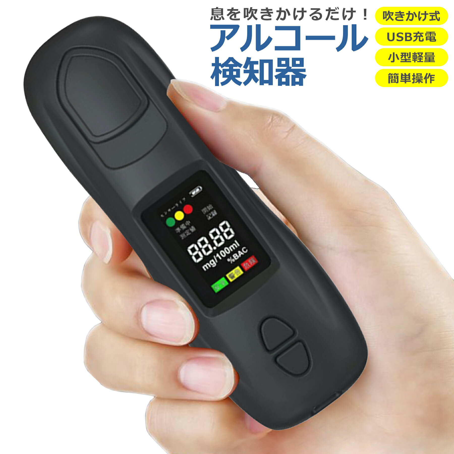 注意事項注意事項 ※飲酒運転は法律で固く禁止されています。 ※飲酒後約20分以上経過してからはかってください。 ※本製品を連続して使用する場合は3〜5分以上間隔をあけてご使用ください。 ※表示には使用条件により多少の誤差が出る場合があります。 健康増進を目的としてご使用ください。 ※本製品の測定データは飲酒の有無を判断するための一つの判断材料であって、運転の可否を判断するものではありません。 ※測定結果に基づいて、車両の運転や機器の操作などを行ってよ行か否かの判断に対して、本製品の製造者、及び販売に携わる関係者は一切責任を負いません。 メーカー希望小売価格メーカー希望小売価格はメーカーカタログに基づいて掲載しています関連キーワードアルコールチェッカー アルコール検知器 高精度 USB 充電式 飲酒運転防止 アルコール検査 検知器 センサー 非接触 簡単 測定 コンパクト 軽量 高感度 業務用 酒気帯び 運転 飲み会 飲酒チェッカー アルコールチェック 飲酒検知器 酒気帯び有無 送料無料 数秒測定 非接触 安全 衛生的 電池式 LCD液晶表示 アルコール 測定 アルコールセンサー 検査 呼気式 日本語説明書付き 関連商品RoiCiel アルコールチェッカー アルコール検知器 飲酒運転防止 ...RoiCiel アルコールチェッカー アルコール検知器 飲酒運転防止 ...RoiCiel アルコールチェッカー アルコール検知器 飲酒運転防止 ...5,980円5,456円5,456円RoiCiel 光る USBケーブル 1m 急速充電 データ転送 LE...【2本目半額クーポン配布中】 RoiCiel 光る USBケーブル 1...【2個セット】RoiCiel Lightning から Dock 変換...2,499円2,499円2,500円RoiCiel USB-A to USB-Cケーブル QC3.0 Qu...RoiCiel USB A to USB C 変換アダプタ アルミ製 ...RoiCiel USB-C to USB-C ケーブル PD 対応 1...2,580円2,580円2,438円【飲酒運転防止】安心安全・大人の新習慣!弊店のアルコールテスターは呼気中のアルコール濃度を、息を吹きかけるだけで手軽に測定可能、飲酒運転を防止用に大切な検知器です。 マウスピースが使用しないので、とても便利の上に衛生です。 運転前、飲み会・パーティーの翌朝、飲みすぎ防止、業務(タクシー会社・鉄道会社・営業会社・バス会社など)前のチェックなど様々なところで大活躍しています。 【高精度&USB充電式&操作簡単】高精度 数秒だけで測定!弊店のアルコールチェッカーには超高感度半導体センサーが搭載しています。 安全に運転できるかどうかを確認するために、数秒だけでアルコール濃度を検出できます。 USB充電式 汎用性高いUSBーCケーブルで簡単に充電されます。 従来の乾電池製品よりもっと便利になり、使用寿命も長くなります。 大容量バッテリーが内蔵しており、いつでも気軽に充電できます。 操作簡単 息を吹きかけるだけで簡単測定!測定準備時間は10秒で、測定時間は10秒です。 ご注意:本製品は飲酒運転の可否を判定する機器ではありません。 【携帯便利】小型で携帯便利!本体サイズは僅かにD6.1cm×W3.8cm×H1.8cm (約22g)で、手のひらの収めて、持ち運びも便利です。 さらに、人間工学設計を基づいて、丸っこい形で滑らかなデザインはおしゃれの上に、手馴染みが良く滑りにくい形状になります。 操作方法★ 息を吹きかけるだけで簡単に呼気中のアルコール濃度をお知らせ ★ 体調や人によって異なる酔い度合いがわかる★ 飲酒時やその前後の測定で、変化がわかるから飲酒のペースを調整できる ★ さりげなく携帯できるスマートなデザイン(携帯ストラップ付け)LCD液晶表示一目瞭然!バックライト液晶モニターを採用しております。 測定データが数字が大きく、コントラストがはっきりしているし、視認性が高くてわかりやすいです。 テスター結果によって、三つの状態が表示します。 「未飲酒状態」:LEDインジケータが緑点灯 「飲酒状態」:LEDインジケータが黄点灯 「酔った状態」:LEDインジケータが赤点灯アルコール含有量濃度チャート注意事項注意事項 ※飲酒運転は法律で固く禁止されています。 ※飲酒後約20分以上経過してからはかってください。 ※本製品を連続して使用する場合は3〜5分以上間隔をあけてご使用ください。 ※表示には使用条件により多少の誤差が出る場合があります。 健康増進を目的としてご使用ください。 ※本製品の測定データは飲酒の有無を判断するための一つの判断材料であって、運転の可否を判断するものではありません。 ※測定結果に基づいて、車両の運転や機器の操作などを行ってよ行か否かの判断に対して、本製品の製造者、及び販売に携わる関係者は一切責任を負いません。 【ブランド紹介&パッケージ内容】RoiCielとは平成26年に日本で生まれた国内ブランドです。 2014年から複数商品がベストセラーに入賞! (ディアルズシーリズ)とはお手頃価格で高品質!コスパ抜群を目指しております。 パッケージ内容:RoiCiel アルコールチェッカー /USB-C充電ケーブル/携帯ストラップ/説明書【商品到着後レビューを投稿&プレゼントをゲット!】【国内企業の安心6ヶ月保証付き、レビューのご