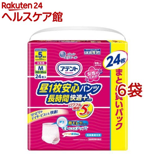 お店TOP>介護>おむつ・失禁対策・トイレ用品>介護用おむつ>介護用おむつパンツタイプ Mサイズ>アテント 昼1枚安心パンツ 長時間快適プラス Mサイズ 女性用 (24枚入*6袋セット)【アテント 昼1枚安心パンツ 長時間快適プラス Mサイズ 女性用の商品詳細】●リハビリ、デイサービスにも、交換できない夜間にも。 ●介助があれば立てる・座れる方。 ●約5回分※の吸収量。 ※1回の排尿量150mlとしてメーカー測定方法による。 ●朝と夜の交換だけでもモレ安心。 ●背モレ防止ポケット採用で就寝時・仰向け寝でも背中からのモレを軽減。 ●すっきり伸縮ゴム採用で装着時のゴワつきを解消。 ●やわらかい肌触り。 ●片手で上げ下げらくらくギャザー。 ●全面通気性シート採用。 ●消臭加工。 ●医療費控除対象品。 【規格概要】・適用:ウエストまわり60cm〜95cm・素材表面材:ポリオレフィン系不織布/吸水材:綿状パルプ、吸収紙、高分子吸水材/防水材:ポリエチレンフィルム/止着材:ポリプロピレン/伸縮材:ポリウレタン、天然ゴム/結合材:スチレン系エラストマー合成樹脂材・外装材:ポリエチレン【原産国】日本【ブランド】アテント【発売元、製造元、輸入元又は販売元】大王製紙※説明文は単品の内容です。 リニューアルに伴い、パッケージ・内容等予告なく変更する場合がございます。 予めご了承ください。 ・単品JAN:4902011779066大王製紙102-0071 東京都千代田区富士見2丁目10番2号 飯田橋グラン・ブルーム(24階)0120-205-205広告文責:楽天グループ株式会社電話:050-5577-5043[大人用紙おむつ 失禁用品/ブランド:アテント/] アテント 昼1枚安心パンツ 長時間快適プラス Mサイズ 女性用(24枚入*6袋セット)【アテント】 13,328 円