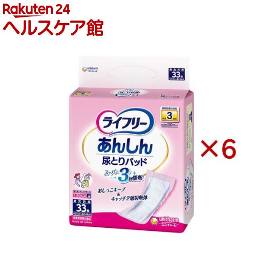 お店TOP>介護>おむつ・失禁対策・トイレ用品>尿とりパッド>尿とりパッド ケース>ライフリー あんしん尿とりパッド スーパー 男女共用 (33枚入×6セット)【ライフリー あんしん尿とりパッド スーパー 男女共用の商品詳細】●尿量の多い方でもおしっこ約3回分を強力スーパー吸収する尿とりパッドです。 ●(1)「おしっこキープ&キャッチ吸収体」が、おしっこ約3回分を強力スーパー吸収●(2)立体ギャザーがスキマをつくらずモレを防いで安心●(3)ズレ止めテープでおむつの中でズレにくい●(4)やわらかなシートでお肌にやさしい【使用方法】・ご使用前に必ずお読みください。 ・別売りの「テープ止めタイプ紙おむつ」と一緒に使います。 ★テープ止めタイプ紙おむつ専用の「尿とりパッド」です。 1.おむつの中心が背骨にくるように敷き、おむつのギャザーの内側に収まるように尿とりパッドを重ねます。 2.体を仰向けにし、尿とりパッドを体にフィットさせながら引き上げて、尿とりパッドの前方を広げます。 3.赤色のズレ止めテープをはがします。 4.おむつを体の中心に合わせ、足ぐりに隙間ができないようにおむつを引き上げます。 5.下のテープは水平もしくは上向きに、上のテープは下向きにとめます。 【規格概要】★素材表面材:ポリオレフィン不織布吸水材:綿状パルプ、吸水紙、高分子吸水材防水材:ポリオレフィンフィルム止着材:紙、スチレン系エラストマー合成樹脂伸縮材:ポリウレタン結合材:スチレン系エラストマー合成樹脂★外装材ポリエチレン【注意事項】・汚れたパッドは早くとりかえてください。 ・テープは直接お肌につけないでください。 ・誤って口に入れたり、のどにつまらせることのないよう、保管場所に注意し、使用後はすぐに処理してください。 開封後は、ほこりや虫が入らないよう、衛生的に保管してください。 【原産国】日本【ブランド】ライフリー 重度良品パッド【発売元、製造元、輸入元又は販売元】ユニ・チャーム※説明文は単品の内容です。 商品に関するお電話でのお問合せは、下記までお願いいたします。 受付時間9:30-17:00(月-金曜日、祝日除く)ベビー用品:0120-192-862生理用品:0120-423-001軽失禁・介護用品(ライフリー):0120-041-062生活用品(化粧パフ・一般ウェットティッシュ・お掃除用品など):0120-573-001衛生用品(マスク):0120-011-529ペットケア用品:0120-810-539リニューアルに伴い、パッケージ・内容等予告なく変更する場合がございます。 予めご了承ください。 ・単品JAN:4903111021796ユニ・チャーム東京都港区三田3-5-19住友不動産三田ガーデンタワー広告文責:楽天グループ株式会社電話:050-5577-5043[大人用紙おむつ 失禁用品/ブランド:ライフリー 重度良品パッド/] ライフリー あんしん尿とりパッド スーパー 男女共用(33枚入×6セット)【ライフリー 重度良品パッド】 8,500 円