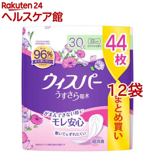 お店TOP>介護>おむつ・失禁対策・トイレ用品>尿とりパッド>尿とりパッド女性用>ウィスパー うすさら吸水 30cc 女性用 吸水ケア 大容量 (44枚入*12袋セット)【ウィスパー うすさら吸水 30cc 女性用 吸水ケア 大容量の商品詳細】●がまんできない時も※ モレ安心●使った96%の人がまた使いたいと答えた※1●動いてもずれにくい●モレ安心&超消臭●ぎっしり詰まった強力吸収体!●スピード吸収●さわやかな香り※ 適切なサイズ・容量の選択が重要です※1 2024年メーカー製品使用者調査n=200●尿漏れパッド 尿とりパッド 女性用【使用方法】(1) 裏面のテープを剥がして使用してください。 (2) 個包装タイプの商品です。 【規格概要】・構成材料表面材:ポリオレフィン不織布(色調:白/紫)・サイズ:22cm【注意事項】★使用上の注意・汚れたパッドは早くとりかえてください。 ・お肌に合わないときは使用を中止し、医師に相談してください。 ・誤って口に入れたり、のどにつまらせることのないよう保管場所に注意し、使用後はすぐに処理してください。 ・窒息の危険を避けるために、包装材料を乳幼児の手の届かないところに保管してください。 ★使用後の処理・汚れた部分を内側にして丸めて、不衛生にならないように処理してください。 ★保管上の注意・開封後は、ほこりや虫が入り込まないよう、衛生的に保管してください。 【原産国】日本【ブランド】ウィスパー【発売元、製造元、輸入元又は販売元】P&G(プロクター&ギャンブル)※説明文は単品の内容です。 商品に関するお電話でのお問合せは、下記までお願いいたします。 受付時間9:15-17:00(月-金曜日、祝日・年末年始を除く)衣料用洗剤・柔軟仕上げ剤:0120-021321食器用洗剤・布製品消臭剤・置き型消臭剤:0120-118226乳幼児用紙おむつ:0120-021329ヘアケア製品:0120-021327マックスファクター化粧品:0120-021325男性用・女性用グルーミング製品:0120-113937ブラウン製品(シェーバー、オーラルケア製品、脱毛器)のお問い合わせにつきましては、下記までお願いいたします。 受付時間9:00-17:30(月-金曜日、祝日・年末年始を除く) 0120-136343リニューアルに伴い、パッケージ・内容等予告なく変更する場合がございます。 予めご了承ください。 ・単品JAN:4902430917100P&G(プロクター&ギャンブル)651-0088 兵庫県神戸市中央区小野柄通7丁目1番18号 ※お問合せ番号は商品詳細参照広告文責:楽天グループ株式会社電話:050-5577-5043[大人用紙おむつ 失禁用品/ブランド:ウィスパー/] ウィスパー うすさら吸水 30cc 女性用 吸水ケア 大容量(44枚入*12袋セット)【ウィスパー】 14,837 円