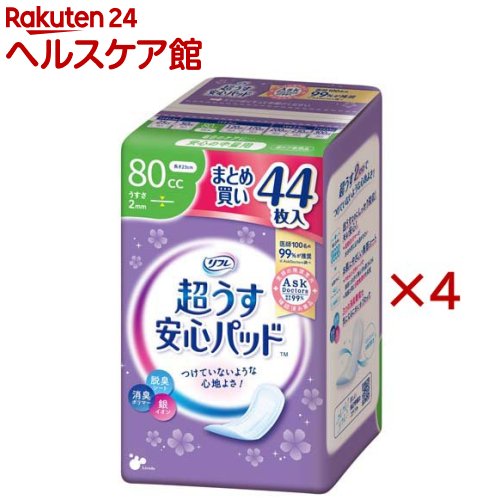 お店TOP>介護>おむつ・失禁対策・トイレ用品>尿とりパッド>尿とりパッド ケース>リフレ 超うす安心パッド 80cc まとめ買いパック【リブドゥ】 (44枚入×4セット)【リフレ 超うす安心パッド 80cc まとめ買いパック【リブドゥ】の商品詳細】●超うす2mmで、つけていないような心地よさ!●高吸収ポリマーで瞬間吸収!●ムレにくい全面通気性。 ●素肌と同じ弱酸性のさらさら素肌シート採用!●銀イオン、脱臭シート、消臭ポリマーのトリプル効果でにおいも安心!●安心の中量用:毎日のケアに・・・●医療費控除対象品【使用方法】★使用後の処理・汚れた部分を内側にして丸めて、不衛生にならないように処理してください。 ・トイレにパッドを捨てないでください。 ・使用後のパッドの廃棄方法は、お住まいの地域のルールに従ってください。 ・外出時に使ったパッドは持ち帰りましょう。 【リフレ 超うす安心パッド 80cc まとめ買いパック【リブドゥ】の原材料】表面材:ポリエチレン/ポリエステル不織布吸水材:高分子吸水材/吸水紙防水材:ポリエチレンフィルム止着材:スチレン系エラストマーなど結合材:スチレン系エラストマーなど外装材:ポリエチレン【規格概要】品名:大人用紙おむつ(軽度失禁用)寸法:巾9.5cm*長さ23cm/薄さ2mm吸収量目安:80cc【注意事項】★使用上の注意・汚れたパッドは早くとりかえてください。 ・テープは直接お肌につけないでください。 ・誤って口に入れたり、のどにつまらせることのないよう保管場所に注意し、使用後はすぐに処理してください。 ・パッドがお肌に合わない場合には、ご使用を中止し、医師にご相談ください。 ★保管上の注意・開封後は、ほこりや虫が入らないよう、衛生的に保管してください。 ★その他の注意・尿モレには尿ケア専用品をお使いください。 ・生理用ナプキンではありません。 ・経血の吸収には不向きです。 【原産国】日本【ブランド】リフレ安心パッド【発売元、製造元、輸入元又は販売元】リブドゥコーポレーション※説明文は単品の内容です。 リニューアルに伴い、パッケージ・内容等予告なく変更する場合がございます。 予めご了承ください。 ・単品JAN:4904585045011リブドゥコーポレーション541-0048 大阪府大阪市中央区瓦町1-6-10 JPビル0120-271-361広告文責:楽天グループ株式会社電話:050-5577-5042[大人用紙おむつ 失禁用品/ブランド:リフレ安心パッド/] リフレ 超うす安心パッド 80cc まとめ買いパック【リブドゥ】(44枚入×4セット)【リフレ安心パッド】 4,515 円