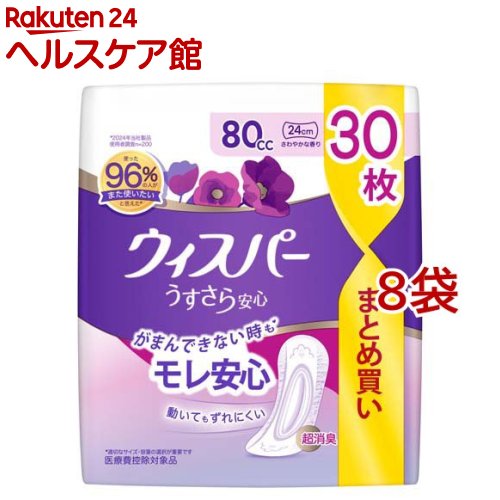 お店TOP>日用品>生理用品>尿もれ用シート・パッド>尿もれ用シート・パッド 中量用>ウィスパー うすさら安心 尿ケアパッド 女性用 80cc (30枚入*8袋セット)【ウィスパー うすさら安心 尿ケアパッド 女性用 80ccの商品詳細】●がまんできない時も※ モレ安心&超消臭●使った96%の人がまた使いたいと答えた※1●動いてもずれにくい●ぎっしり詰まった強力吸収体!●スピード吸収●吸収エリア幅広設計※2●ぴったりフィット●横モレ防止デザイン●超スピード消臭技術!●長さ24cmに変更し、幅が広くなりました※適切なサイズ・容量の選択が重要です※1:2024年メーカー製品使用者調査n=200※2:メーカー従来品比較●尿漏れパッド 尿とりパッド 女性用【ウィスパー うすさら安心 尿ケアパッド 女性用 80ccの原材料】表面材:ポリオレフィン不織布/吸水材:綿状パルプ、高分子吸水材/防水材(バックシート):ポリオレフィンフィルム/伸縮材:合成樹脂/結合材・止着材:ホットメルト粘着材【規格概要】サイズ:27cm【注意事項】・誤って口に入れたり、のどにつまらせることのないよう保管場所に注意し、使用後はすぐに処理してください。 ・窒息の危険を避けるために、包装材料を乳幼児の手の届かないところに保管してください。 ・生理用ナプキンではありません。 ・汚れたパッドは早くとりかえてください。 ・テープは直接お肌につけないでください。 ・お肌に合わないときは使用を中止し、医師に相談してください。 ・汚れた部分を内側にして丸めて、不衛生にならないように処理してください。 ・トイレにパッドを捨てないで(流さないで)ください。 ・外出時に使ったパッドは持ち帰りましょう。 ・使用後のパッドの廃棄方法は、お住まいの地域のルールに従ってください。 ・裏面のテープを剥がして使用してください。 ・個包装タイプの商品です。 ・開封後は、ほこりや虫が入り込まないよう、衛生的に保管してください。 【原産国】日本【ブランド】ウィスパー【発売元、製造元、輸入元又は販売元】P&G(プロクター&ギャンブル)※説明文は単品の内容です。 商品に関するお電話でのお問合せは、下記までお願いいたします。 受付時間9:15-17:00(月-金曜日、祝日・年末年始を除く)衣料用洗剤・柔軟仕上げ剤:0120-021321食器用洗剤・布製品消臭剤・置き型消臭剤:0120-118226乳幼児用紙おむつ:0120-021329ヘアケア製品:0120-021327マックスファクター化粧品:0120-021325男性用・女性用グルーミング製品:0120-113937ブラウン製品(シェーバー、オーラルケア製品、脱毛器)のお問い合わせにつきましては、下記までお願いいたします。 受付時間9:00-17:30(月-金曜日、祝日・年末年始を除く) 0120-136343リニューアルに伴い、パッケージ・内容等予告なく変更する場合がございます。 予めご了承ください。 ・単品JAN:4902430874342P&G(プロクター&ギャンブル)651-0088 兵庫県神戸市中央区小野柄通7丁目1番18号 ※お問合せ番号は商品詳細参照広告文責:楽天グループ株式会社電話:050-5577-5043[衛生用品/ブランド:ウィスパー/] ウィスパー うすさら安心 尿ケアパッド 女性用 80cc(30枚入*8袋セット)【ウィスパー】 11,179 円