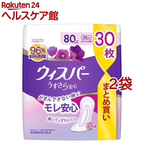 お店TOP>日用品>生理用品>尿もれ用シート・パッド>尿もれ用シート・パッド 中量用>ウィスパー うすさら安心 尿ケアパッド 女性用 80cc (30枚入*2袋セット)【ウィスパー うすさら安心 尿ケアパッド 女性用 80ccの商品詳細】●がまんできない時も※ モレ安心&超消臭●使った96%の人がまた使いたいと答えた※1●動いてもずれにくい●ぎっしり詰まった強力吸収体!●スピード吸収●吸収エリア幅広設計※2●ぴったりフィット●横モレ防止デザイン●超スピード消臭技術!●長さ24cmに変更し、幅が広くなりました※適切なサイズ・容量の選択が重要です※1:2024年メーカー製品使用者調査n=200※2:メーカー従来品比較●尿漏れパッド 尿とりパッド 女性用【ウィスパー うすさら安心 尿ケアパッド 女性用 80ccの原材料】表面材:ポリオレフィン不織布/吸水材:綿状パルプ、高分子吸水材/防水材(バックシート):ポリオレフィンフィルム/伸縮材:合成樹脂/結合材・止着材:ホットメルト粘着材【規格概要】サイズ:27cm【注意事項】・誤って口に入れたり、のどにつまらせることのないよう保管場所に注意し、使用後はすぐに処理してください。 ・窒息の危険を避けるために、包装材料を乳幼児の手の届かないところに保管してください。 ・生理用ナプキンではありません。 ・汚れたパッドは早くとりかえてください。 ・テープは直接お肌につけないでください。 ・お肌に合わないときは使用を中止し、医師に相談してください。 ・汚れた部分を内側にして丸めて、不衛生にならないように処理してください。 ・トイレにパッドを捨てないで(流さないで)ください。 ・外出時に使ったパッドは持ち帰りましょう。 ・使用後のパッドの廃棄方法は、お住まいの地域のルールに従ってください。 ・裏面のテープを剥がして使用してください。 ・個包装タイプの商品です。 ・開封後は、ほこりや虫が入り込まないよう、衛生的に保管してください。 【原産国】日本【ブランド】ウィスパー【発売元、製造元、輸入元又は販売元】P&G(プロクター&ギャンブル)※説明文は単品の内容です。 商品に関するお電話でのお問合せは、下記までお願いいたします。 受付時間9:15-17:00(月-金曜日、祝日・年末年始を除く)衣料用洗剤・柔軟仕上げ剤:0120-021321食器用洗剤・布製品消臭剤・置き型消臭剤:0120-118226乳幼児用紙おむつ:0120-021329ヘアケア製品:0120-021327マックスファクター化粧品:0120-021325男性用・女性用グルーミング製品:0120-113937ブラウン製品(シェーバー、オーラルケア製品、脱毛器)のお問い合わせにつきましては、下記までお願いいたします。 受付時間9:00-17:30(月-金曜日、祝日・年末年始を除く) 0120-136343リニューアルに伴い、パッケージ・内容等予告なく変更する場合がございます。 予めご了承ください。 ・単品JAN:4902430874342P&G(プロクター&ギャンブル)651-0088 兵庫県神戸市中央区小野柄通7丁目1番18号 ※お問合せ番号は商品詳細参照広告文責:楽天グループ株式会社電話:050-5577-5042[衛生用品/ブランド:ウィスパー/] ウィスパー うすさら安心 尿ケアパッド 女性用 80cc(30枚入*2袋セット)【ウィスパー】 2,795 円