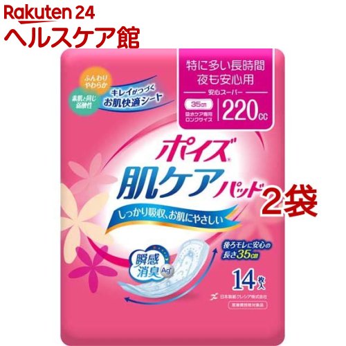 お店TOP>日用品>生理用品>尿もれ用シート・パッド>尿もれ用シート・パッド全部>ポイズ 肌ケアパッド 吸水ナプキン 特に多い長時間・夜も安心用(安心スーパー) 220cc (14枚入*2袋セット)【ポイズ 肌ケアパッド 吸水ナプキン 特に多い長時間・夜も安心用(安心スーパー) 220ccの商品詳細】●すぐに消臭ニオイ戻りも防ぐ、さらに24時間抗菌でニオイ菌の増殖を防ぐ●水分をしっかり閉じ込め、表面のさらさら感がつづく●2枚重ねの立体ギャザーとサイドギャザーが横モレを防ぐ●つけ心地ふんわり●後ろモレに安心の長さ35cm●素肌と同じ弱酸性●ムレにくい全面通気性●かわいい花柄エンボス●吸収量の目安:220CC●サイズ:幅12*長さ35cm医療費控除対象品【成分】表面材:ポリオレフィン系不織布、吸収材:綿状パルプ・高分子吸収材・吸収紙、防水材:ポリエチレンラミネート不織布【規格概要】吸収量の目安:220cc、サイズ:幅12*長さ35cm【保存方法】・開封後はほこりや虫が入らないよう、衛生的に管理してください。 ・高温になる場所での保管は避けてください。 【注意事項】・汚れたパッドは早く取り替えてください。 ・テープは直接お肌につけないでください。 ・お肌に合わないときは医師に相談してください。 ・洗濯はしないでください。 ・メーカーの都合により仕様・パッケージ等が変更になる場合がございます。 【原産国】日本【ブランド】ポイズ【発売元、製造元、輸入元又は販売元】日本製紙クレシア※説明文は単品の内容です。 リニューアルに伴い、パッケージ・内容等予告なく変更する場合がございます。 予めご了承ください。 (ポイズパット)・単品JAN:4901750801885日本製紙クレシア101-8215 東京都千代田区神田駿河台4-60120-870-357広告文責:楽天グループ株式会社電話:050-5577-5043[大人用紙おむつ 失禁用品/ブランド:ポイズ/] ポイズ 肌ケアパッド 吸水ナプキン 特に多い長時間・夜も安心用(安心スーパー) 220cc(14枚入*2袋セット)【ポイズ】 1,740 円