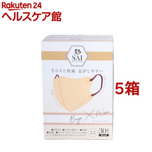 お店TOP>衛生医療>マスク>マスク全部>マスク全部>彩 SAI 立体マスク 個包装 ベージュ*ワイン ふつうサイズ (30枚入*5箱セット)【彩 SAI 立体マスク 個包装 ベージュ*ワイン ふつうサイズの商品詳細】●マスク本体の色はベージュ、耳紐の色はワイン。 ●衛生面・持ち運びに便利な個別包装タイプ。 ●耳が痛くなりにくいソフトゴム6mmを採用。 ●BFE、VFE、PFE 99%カット。 ※メーカーの都合により、パッケージ・仕様等は予告なく変更になる場合がございます。 【使用方法】1.上下を確認し左右に広げます。 SAIロゴが下です。 2.ゴム紐を引っ張りながら耳にかけます。 3.鼻からアゴを覆う位置が正しい位置です。 【規格概要】・サイズ本体サイズ:137mm*105mm・材質表地・フィルター・裏地:ポリプロピレン、耳ひも部:ポリエステル・ポリウレタン【注意事項】★使用上の注意・個人差により、眼鏡が曇る場合がありますので、運転の際などは十分にご注意ください。 ・本品は使い切り商品です。 衛生上および機能上、マスクの使用は1回とし、再使用しないでください。 ・肌に異常がある場合は、使用しないでください。 ・万一、臭いにより気分が悪くなった場合は、ご使用をおやめください。 ・万一、かゆみ・カブレ等の異常があらわれた場合は、直ちに使用をやめ、医師にご相談ください。 ・本品は有害な粉塵やガス等の発生する場所での使用はできません。 ・火気のそばでのご使用はおやめください。 ・用途以外には使用しないでください。 ・誤った使用方法に起因する損害は一切補償いたしません。 ★保管上の注意・乳幼児の手の届かない所に保管してください。 ・高温多湿な場所、直射日光の当たる場所での保管は避けてください。 【原産国】中国【発売元、製造元、輸入元又は販売元】日翔※説明文は単品の内容です。 リニューアルに伴い、パッケージ・内容等予告なく変更する場合がございます。 予めご了承ください。 ・単品JAN:4570084520986日翔広告文責:楽天グループ株式会社電話:050-5577-5042[マスク] 彩 SAI 立体マスク 個包装 ベージュ*ワイン ふつうサイズ(30枚入*5箱セット) 4,089 円