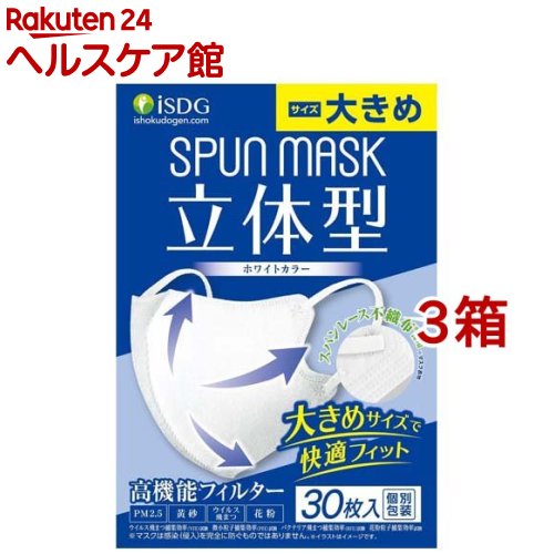 お店TOP>衛生医療>マスク>マスク全部>使い捨てマスク 大容量(30枚以上)>立体型スパンレース不織布カラーマスク ホワイト 大きめ (30枚入*3箱セット)【立体型スパンレース不織布カラーマスク ホワイト 大きめの商品詳細】●ウイルス飛沫、花粉等のカットだけでなく、ファッション性を兼ね備えたカラーの不織布マスクです。 ●3層の不織布でしっかりガード・息らくらく口元立体形状やわらかい平ゴムを採用し、耳が痛くなりにくい・口元やわらか素材。 ※マスクは感染(侵入)を完全に防ぐものではありません。 【使用方法】1.マスクの上下を確認して、左右に広げます。 2.耳ゴム部分を伸ばし、両耳にかけます。 3.マスク位置を調整し、隙間がないよう着用してください。 【規格概要】マスク表地:ポリエステル、マスク裏地・フィルター:ポリプロピレン、耳ゴム:ナイロン・ポリエステル・ポリウレタンサイズ:約9.4cm*約15.2cm【注意事項】★使用上の注意・本商品は有毒な粉塵やガス等を防ぐ目的では使用できません。 ・本商品の使用により、かゆみ、かぶれ、発疹等が生じた場合は使用を中止し、医師または薬剤師にご相談ください。 ・本商品の使用中、臭いで気分が悪くなった場合や息苦しさを感じた場合には使用を中止してください。 ・乳幼児の手の届かない所に保管してください。 ・高温多湿な場所や、直射日光の当たる場所を避けて保管してください。 ・火気のそばでの保管や使用は避けてください。 ・マスクを着用中、耳に痛みや不快感を感じた場合には使用を一時中断してください。 ・耳ゴムがきつい場合には、軽く伸ばしてお使いください。 ・マスクは使い切りタイプですので、洗って再利用はしないでください。 ・柔らかい素材を使用しておりますので、使用状況により、不織布の毛羽立ちなどが見られる場合がございます。 健康を害することはございませんが、新しいものをお使いください。 ・個人差により、メガネが曇る場合がありますので、運転時などはご注意ください。 ・製造上、サイズに若干の差異がありますがご了承ください。 【原産国】中国【ブランド】医食同源ドットコム【発売元、製造元、輸入元又は販売元】医食同源ドットコム※説明文は単品の内容です。 リニューアルに伴い、パッケージ・内容等予告なく変更する場合がございます。 予めご了承ください。 ・単品JAN:4562355182573医食同源ドットコム336-0027 埼玉県さいたま市南区沼影1-10-1ラムザタワー7階0120-362-916広告文責:楽天グループ株式会社電話:050-5577-5042[マスク/ブランド:医食同源ドットコム/] 立体型スパンレース不織布カラーマスク ホワイト 大きめ(30枚入*3箱セット)【医食同源ドットコム】 2,420 円