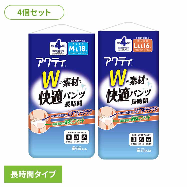 「アクティ Wの素材で快適パンツ 長時間」は歩ける方・立てる方・座れる方におすすめの大人用紙おむつです。 お腹まわりの伸縮素材が指に引っかかりやすく、上げ下げラクラクではきやすい!肌着感覚の素材で身体にフィットし、快適なはきごこち!浅めの股上でお腹まわりすっきり!肌着らしさとはきやすさに加え、全面通気性でムレを防いでお肌さらさら。 消臭ポリマー配合。 ※アンモニアについての消臭効果がみられます。 【M−Lサイズ 18枚】●長時間タイプ:L-LL●ウエストサイズ:60-90cm●吸収量目安:約4回分●内容量18枚●材質表面材:ポリプロピレン不織布吸水材:綿状パルプ/高分子吸水材防水材:ポリエチレンフィルム伸縮材:ポリウレタン結合材:ホットメルト粘着剤【L−LLサイズ 16枚】●長時間タイプ:L-LL●ウエストサイズ:80-125cm●吸収量目安:約4回分●内容量16枚●材質表面材:ポリプロピレン不織布吸水材:綿状パルプ/高分子吸水材防水材:ポリエチレンフィルム伸縮材:ポリウレタン結合材:ホットメルト粘着剤(検索用:アクティ Wの素材で快適パンツ 大人用紙おむつ 大人用オムツ 大人用おむつ 介護おむつ 介護パンツ 長時間 4回分吸収 M-L 4901750890735 4901750890711)最強翌日配送対象商品に関するご案内 最強翌日配送対象商品・対象地域に該当する場合は最強翌日配送マークがご注文カゴ近くに表示されます。 最強翌日配送可能なお支払方法は【クレジットカード、代金引換、全額ポイント支払い】のみとなります。 下記の場合は最強翌日配送対象外となります。 ・15点以上ご購入いただいた場合 ・時間指定がある場合 ・ご注文時備考欄にご記入がある場合 ・決済処理にお時間を頂戴する場合 ・郵便番号や住所に誤りがある場合 ・最強翌日配送対象外の商品とご一緒にご注文いただいた場合 ・お届け先住所文字数が40文字以上の場合 【4個セット】アクティ Wの素材で快適パンツ 長時間 M-Lサイズ 18枚アクティ Wの素材で快適パンツ 大人用紙おむつ 大人用オムツ 大人用おむつ 介護おむつ 介護パンツ 長時間 4回分吸収 M-L M-Lサイズ 18枚 L-LLサイズ 16枚 5,780 円