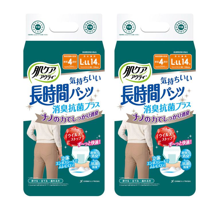 【医療控除対象品】弱くなりがちなシニアの肌へおすすめな介護おむつ。 歩ける方、立てる方、座れる方に。 尿・汗・便臭をやわらげる抗菌効果のある超強力消臭シートで、気になるニオイも瞬間消臭。 「ウイルスストップ」機能で、シート状のウイルスの数も減少。 (※すべてのウイルスに効果があるわけではありません。 また、感染予防を目的とするものではございません。 )「立体エンボスさらっふわっ快適シート」でムレにくく、お肌にやさしい。 お腹まわりゆったり+背中はぴったりフィットするから、どんな姿勢でもはき心地快適。 吸収体「スリット」で股下にもぴったりフィットし、モレにくい。 お試しにも便利なL-LLサイズ、14枚、レギュラータイプ。 ●容量(枚数)14枚×2個セット●サイズL〜LL●ウエストサイズウエストサイズ:80cm〜130●吸収量目安おしっこ約4回分※1回の吸収量の目安を150mlの場合●その他後処理テープ付き(検索用:肌ケアアクティ 大人用紙おむつ 介護オムツ 長時間パンツ おしっこ約4回分 L-LL 消臭 抗菌 14枚 医療控除対象品 4901750806538) 最強翌日配送対象商品に関するご案内 最強翌日配送対象商品・対象地域に該当する場合は最強翌日配送マークがご注文カゴ近くに表示されます。 最強翌日配送可能なお支払方法は【クレジットカード、代金引換、全額ポイント支払い】のみとなります。 下記の場合は最強翌日配送対象外となります。 ・15点以上ご購入いただいた場合 ・時間指定がある場合 ・ご注文時備考欄にご記入がある場合 ・決済処理にお時間を頂戴する場合 ・郵便番号や住所に誤りがある場合 ・最強翌日配送対象外の商品とご一緒にご注文いただいた場合 ・お届け先住所文字数が40文字以上の場合 【2個セット】 肌ケア アクティ 大人用紙おむつ 長時間パンツ 約4回分 消臭抗菌プラス L-LL 14枚 肌ケアアクティ 大人用紙おむつ 介護オムツ 長時間パンツ おしっこ約4回分 L-LL 消臭 抗菌 14枚 医療控除対象品 紙クレシア 【D】 2,647 円