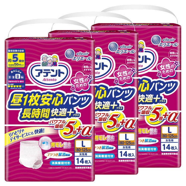 ※リニューアルに伴いパッケージ・内容等予告なく変更する場合がございます。 予めご了承ください。 [医療費控除対象品]介助があれば立てる・座れる方におすすめ、朝と夜の交換だけでもモレ安心。 ・約5.5回分*の吸収量、朝と夜の交換だけでもモレ安心。 *1回の排尿量150mlとして、当社測定方法による。 ・背モレ防止ポケット採用で就寝時 仰向け寝でも背中からのモレを軽減。 ・すっきり伸縮ゴム採用で装着時のゴワつきを解消。 ・やわらかい肌触り。 ・片手で上げ下げらくらくギャザー。 ・おなかまわりの糸ゴムと脚まわりの糸ゴムは女性らしいピンク色の素材を採用。 (色以外は昼1枚安心パンツ長時間快適プラス男女共用と同じ仕様です。 )・全面通気性シート採用。 ・消臭加工。 ●内容量14枚入×3個セット●サイズLサイズ(女性用 ウエストまわり80〜125cm)●材質表面材:ポリオレフィン系不織布吸水材:綿状パルプ、吸収紙、高分子吸水材防水材:ポリエチレンフィルム止着材:ポリプロピレン伸縮材:ポリウレタン、天然ゴム結合材:スチレン系エラストマー合成樹脂材●原産国日本●ご使用上の注意(ご使用前に必ずお読みください。 )お肌に合わないときは、ご使用を中止して、医師にご相談ください。 誤って紙おむつを口に入れたり、のどにつまらせたりすることがないように保管には十分注意し、使用後はすみやかに処理してください。 万一、紙おむつの一部を食べてしまった場合は、早急に最寄りの医師におみせください。 暖房器具の近く等、高温になる場所に置かないでください。 洗濯しないでください。 誤って洗濯した場合は、脱水後、衣類に付着したパルプや高分子吸水材(ゼリー状の粒)を振り落としてください。 また、洗濯機内部に残ったものは取り除いてください。 ★関連商品はこちら★★アテント 昼1枚安心パンツ 長時間快適プラス Lサイズ 女性用 14枚★アテント 昼1枚安心パンツ 長時間快適プラス Lサイズ 女性用 22枚★[3個セット] アテント 昼1枚安心パンツ 長時間快適プラス Lサイズ 女性用 66枚(検索用:Attento パンツタイプ 長時間安心 Lサイズ 女性用 約5.5回分 背モレ防止ポケット すっきり伸縮ゴム エリエール 大王製紙 4902011778984) 最強翌日配送対象商品に関するご案内 最強翌日配送対象商品・対象地域に該当する場合は最強翌日配送マークがご注文カゴ近くに表示されます。 最強翌日配送可能なお支払方法は【クレジットカード、代金引換、全額ポイント支払い】のみとなります。 下記の場合は最強翌日配送対象外となります。 ・15点以上ご購入いただいた場合 ・時間指定がある場合 ・ご注文時備考欄にご記入がある場合 ・決済処理にお時間を頂戴する場合 ・郵便番号や住所に誤りがある場合 ・最強翌日配送対象外の商品とご一緒にご注文いただいた場合 ・お届け先住所文字数が40文字以上の場合 [3個セット] アテント 昼1枚安心パンツ 長時間快適プラス Lサイズ 女性用 42枚(14枚×3) Attento パンツタイプ 長時間安心 Lサイズ 女性用 約5.5回分 背モレ防止ポケット すっきり伸縮ゴム エリエール 大王製紙 6,281 円