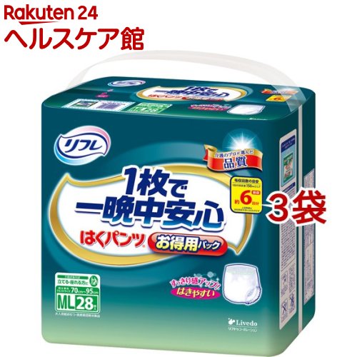 お店TOP>介護>おむつ・失禁対策・トイレ用品>介護用おむつ>介護用おむつパンツタイプ薄型 Mサイズ>リフレ はくパンツ 1枚で一晩中安心 ML【リブドゥ】 (28枚入*3袋セット)【リフレ はくパンツ 1枚で一晩中安心 ML【リブドゥ】の商品詳細】●すっきり感アップではきやすい!●1枚はくだけで夜も安心の吸収力!●股下すっきりフィット。 股下すっきりカットでゴワゴワせず動きやすい!●やさしい肌ざわり。 ふんわり柔軟仕上げでお肌にやさしい。 ●モレにくい。 おしっこ6回分を吸収するので長時間でも安心。 横モレ防止ギャザーが足まわりにフィットし、尿をせき止めます。 ●はきやすい。 お腹まわりはしめつけないのに、やさしく体にフィットし、ズレを防止。 ●全面通気性シート。 ●男女兼用。 ●医療費控除対象品。 【使用方法】★はき方・ウエストギャザーに色がついている方が前です。 前後を確かめてください。 ・普通の下着と同じようにはいてください。 ★とりかえ方・使用後はそのまま脱ぐか、両サイドを下から破ってはずします。 ★使用後の処理・使用後は小さく丸めてから、後ろの捨てテープの青色のつまみをはがしてとめてください。 【品名・名称】大人用紙おむつ【リフレ はくパンツ 1枚で一晩中安心 ML【リブドゥ】の原材料】表面材・・・ポリオレフィン系不織布吸水材・・・綿状パルプ、吸収紙、高分子吸収材防水材・・・ポリオレフィン系フィルム止着材・・・ポリオレフィンなど伸縮材・・・ポリウレタン系結合材・・・スチレン系エラストマーなど【規格概要】適用対象・・・70cm-95cm(ウエストサイズ)【注意事項】・紙おむつ、包装材は、誤飲のおそれのある幼児、ご老人のお手元に届かないようご配慮ください。 ・紙おむつを火に近づけると引火のおそれがあります。 ・紙おむつや肌が汚れているとカブレの原因になるので、こまめに交換し、清潔にしてください。 ・紙おむつの中の高分子吸収材が出て、肌に付着した場合は濡れタオルで拭き取ってください。 ・あやまって紙おむつの一部を食べてしまった場合は、早急に最寄りの医師におみせください。 ・本製品は洗濯できません。 あやまって洗濯すると中身が他の衣類に付着します。 その場合は、衣類を脱水してから、よくはたいてください。 洗濯機の内部はよく拭き取った後、水で洗い流してください。 ★使用上の注意・汚れた紙おむつは早くとりかえてください。 ・誤って口に入れたり、のどにつまらせることのないように保管場所に注意し、使用後はすぐに処理してください。 ★保管上の注意・開封後は、ほこりや虫が入らないよう、衛生的に保管してください。 ★使用後の処理・紙おむつに付着した大便は、トイレに始末してください。 ・汚れた部分を内側にして丸めて、不衛生にならないように処理してください。 ・トイレに紙おむつを捨てないでください。 ・使用後の紙おむつの廃棄方法は、お住いの地域ルールに従ってください。 ・外出時に使った紙おむつは持ち帰りましょう。 【ブランド】リフレ はくパンツ【発売元、製造元、輸入元又は販売元】リブドゥコーポレーション※説明文は単品の内容です。 リニューアルに伴い、パッケージ・内容等予告なく変更する場合がございます。 予めご了承ください。 (履くパンツ 薄くて快適)・単品JAN:4904585035173リブドゥコーポレーション541-0048 大阪府大阪市中央区瓦町1-6-10 JPビル0120-271-361広告文責:楽天グループ株式会社電話:050-5577-5042[大人用紙おむつ 失禁用品/ブランド:リフレ はくパンツ/] リフレ はくパンツ 1枚で一晩中安心 ML【リブドゥ】(28枚入*3袋セット)【リフレ はくパンツ】 8,639 円