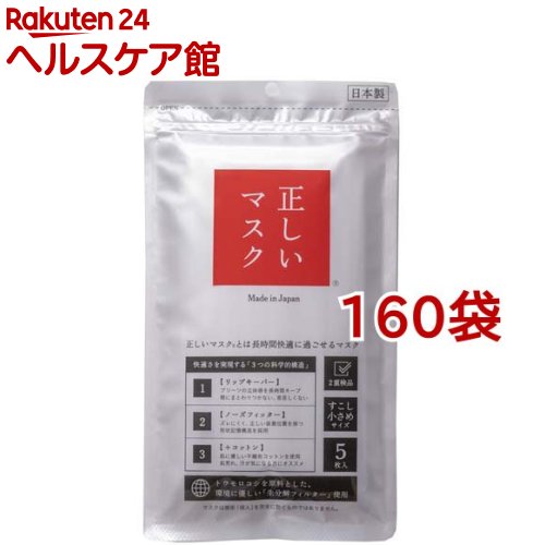 お店TOP>衛生医療>マスク>マスク 形状・素材別>不織布マスク>正しいマスク すこし小さめサイズ (5枚入*160袋セット)【正しいマスク すこし小さめサイズの商品詳細】●正しいマスクそれは「長時間、口まわり空間を維持し快適に過ごせるマスク」●ポイント(1)唇にまとわりつかない「プリーツの立体感を長時間キープ」●ポイント(2)ズレにくく正しい装着位置を保つ「形状記憶構造」それぞれの顔に合った空間形状を作り保持性能を飛躍的に向上する●ポイント(3)肌に優しい素材を採用「大切な目元に+コットン」吸湿性と肌触りに優れた高品質でやわらかなコットン繊維を使用。 繊細な目元にやさしい!【正しいマスク すこし小さめサイズの原材料】・本体(ポリエステル・ポリエチレン・ポリプロピレン・コットン)、ノーズフィッター(ポリエチレン)、耳ひも部(ナイロン・ポリウレタン)、包装材(ポリエチレン・ポリエステル)【規格概要】・サイズ:16cm×9cm【注意事項】・有害な粉塵やガス等が発生する場所でのご使用はできません。 ・火気のそばでのご使用はおやめください。 ・万一、臭いにより気分が悪くなった場合は、ご使用をおやめください。 ・乳幼児の手の届かないところに保管してください。 ・乳幼児や呼吸器に異常がある方は使用しないでください。 ・お肌に異常があるとき、またはお肌に合わない場合は、ご使用をおやめください。 ・使い切り商品のため、洗濯などでの再使用はできません。 1日1枚のご使用をお勧めします。 ・高沼多湿、直射日光のあたる所は避けて保管してください。 ・個人差により、眼鏡が曇る場合があります。 運転の際などは十分にご注意ください。 ・マスクを取り出す際は、ひもではなく、マスク本体を持って引き出してください。 【原産国】日本【発売元、製造元、輸入元又は販売元】CROSSEED※説明文は単品の内容です。 リニューアルに伴い、パッケージ・内容等予告なく変更する場合がございます。 予めご了承ください。 ・単品JAN:4562239778885CROSSEED福岡県飯塚市幸袋172-18 飯塚リサーチパーク0948-29-1761広告文責:楽天グループ株式会社電話:050-5577-5043[マスク] 正しいマスク すこし小さめサイズ(5枚入*160袋セット) 53,867 円