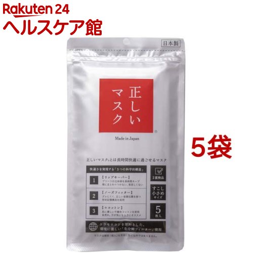 お店TOP>衛生医療>マスク>マスク 形状・素材別>不織布マスク>正しいマスク すこし小さめサイズ (5枚入*5袋セット)【正しいマスク すこし小さめサイズの商品詳細】●正しいマスクそれは「長時間、口まわり空間を維持し快適に過ごせるマスク」●ポイント(1)唇にまとわりつかない「プリーツの立体感を長時間キープ」●ポイント(2)ズレにくく正しい装着位置を保つ「形状記憶構造」それぞれの顔に合った空間形状を作り保持性能を飛躍的に向上する●ポイント(3)肌に優しい素材を採用「大切な目元に+コットン」吸湿性と肌触りに優れた高品質でやわらかなコットン繊維を使用。 繊細な目元にやさしい!【正しいマスク すこし小さめサイズの原材料】・本体(ポリエステル・ポリエチレン・ポリプロピレン・コットン)、ノーズフィッター(ポリエチレン)、耳ひも部(ナイロン・ポリウレタン)、包装材(ポリエチレン・ポリエステル)【規格概要】・サイズ:16cm×9cm【注意事項】・有害な粉塵やガス等が発生する場所でのご使用はできません。 ・火気のそばでのご使用はおやめください。 ・万一、臭いにより気分が悪くなった場合は、ご使用をおやめください。 ・乳幼児の手の届かないところに保管してください。 ・乳幼児や呼吸器に異常がある方は使用しないでください。 ・お肌に異常があるとき、またはお肌に合わない場合は、ご使用をおやめください。 ・使い切り商品のため、洗濯などでの再使用はできません。 1日1枚のご使用をお勧めします。 ・高沼多湿、直射日光のあたる所は避けて保管してください。 ・個人差により、眼鏡が曇る場合があります。 運転の際などは十分にご注意ください。 ・マスクを取り出す際は、ひもではなく、マスク本体を持って引き出してください。 【原産国】日本【発売元、製造元、輸入元又は販売元】CROSSEED※説明文は単品の内容です。 リニューアルに伴い、パッケージ・内容等予告なく変更する場合がございます。 予めご了承ください。 ・単品JAN:4562239778885CROSSEED福岡県飯塚市幸袋172-18 飯塚リサーチパーク0948-29-1761広告文責:楽天グループ株式会社電話:050-5577-5043[マスク] 正しいマスク すこし小さめサイズ(5枚入*5袋セット) 1,370 円