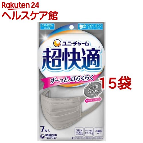 お店TOP>衛生医療>マスク>マスク 形状・素材別>不織布マスク>超快適マスク プリーツタイプ ライトグレー ふつう (7枚入*15袋セット)【超快適マスク プリーツタイプ ライトグレー ふつうの商品詳細】●やわらかストレッチ耳かけで、ず〜っと、耳らくらく!●長時間でも耳が痛くなりにくい。 更に、本物シルク配合!●ウイルス飛沫カットフィルタ(R)で、空気中のウイルス飛沫・花粉の侵入をしっかりブロックします。 ●PM2.5にも。 【使用方法】・機能性の維持、衛生面から、1日1枚のご使用をお勧めします。 1.仮止めをはずします。 2.マスク下部のアルファベットが正しく読める面を表側にしてください。 耳かけを引っ張りながら、マスクを耳にかけます。 3.「ノーズフィット」を鼻の形に合わせてフィットさせます。 プリーツの折り目を縦に伸ばしてマスクを広げます。 【規格概要】・素材:本体・フィルタ部(ポリオレフィン)、耳かけ部(ポリオレフィン・ポリウレタン)、ノーズフィット部(ポリオレフィン)・包装材の材質:ポリプロピレン【注意事項】・個人差により、眼鏡が曇る場合がありますので、運転の際などは十分にご注意ください。 ・本品は使いきり商品です。 洗濯による再使用はできません。 ・耳かけを引っ張りすぎると、ゆるくなることがあります。 ・本品は有害な粉塵やガス等の発生する場所でのご使用はできません。 ・肌に異常がある場合は、使用しないでください。 ・万一、肌にかゆみ・かぶれ・しめつけや擦れによる異常があらわれた場合は、直ちにご使用をやめ、医師にご相談ください。 ・万一、臭いにより気分が悪くなった場合は、ご使用をおやめください。 ・お子様の睡眠時のご使用は、安全性を考慮し、お控えください。 ・乳幼児の手の届かない所に保管してください。 ・高温多湿な場所、直射日光の当たる場所での保管は避けてください。 ・火気のそばでのご使用はおやめください。 【原産国】日本【ブランド】超快適マスク【発売元、製造元、輸入元又は販売元】ユニ・チャーム※説明文は単品の内容です。 商品に関するお電話でのお問合せは、下記までお願いいたします。 受付時間9:30-17:00(月-金曜日、祝日除く)ベビー用品:0120-192-862生理用品:0120-423-001軽失禁・介護用品(ライフリー):0120-041-062生活用品(化粧パフ・一般ウェットティッシュ・お掃除用品など):0120-573-001衛生用品(マスク):0120-011-529ペットケア用品:0120-810-539リニューアルに伴い、パッケージ・内容等予告なく変更する場合がございます。 予めご了承ください。 ・単品JAN:4903111520756ユニ・チャーム東京都港区三田3-5-19住友不動産三田ガーデンタワー広告文責:楽天グループ株式会社電話:050-5577-5043[マスク/ブランド:超快適マスク/] 超快適マスク プリーツタイプ ライトグレー ふつう(7枚入*15袋セット)【超快適マスク】 4,368 円