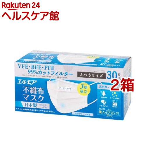お店TOP>衛生医療>マスク>マスク全部>使い捨てマスク 大容量(30枚以上)>エルモア 不織布マスク ふつうサイズ (30枚入*2箱セット)【エルモア 不織布マスク ふつうサイズの商品詳細】●安心の日本製●VFE・BFE・PFE99%カットフィルター採用!・3層構造の高密度フィルターで空気中のウイルス飛沫・花粉などの侵入をブロック。 ・マスクの米国規格(ASTM F2100-20)のレベル1に適合したサージカルマスク。 ●ノーズフィット構造で、鼻のラインにぴったりフィット。 ●呼吸がラクで、口の動きにも柔軟に対応する、プリーツ構造で使いやすい。 ●柔らかく伸縮性の高いゴムを採用。 ●マスクは感染(侵入)を完全に防ぐものではありません。 【規格概要】マスクサイズ:約95*175mm【注意事項】・マスクは感染を完全に防ぐものではありません。 【原産国】日本【ブランド】エルモア【発売元、製造元、輸入元又は販売元】カミ商事※説明文は単品の内容です。 リニューアルに伴い、パッケージ・内容等予告なく変更する場合がございます。 予めご了承ください。 ・単品JAN:4971633910102カミ商事愛媛県四国中央市三島宮川1-2-270896ー24-5316広告文責:楽天グループ株式会社電話:050-5577-5043[マスク/ブランド:エルモア/] エルモア 不織布マスク ふつうサイズ(30枚入*2箱セット)【エルモア】 2,037 円