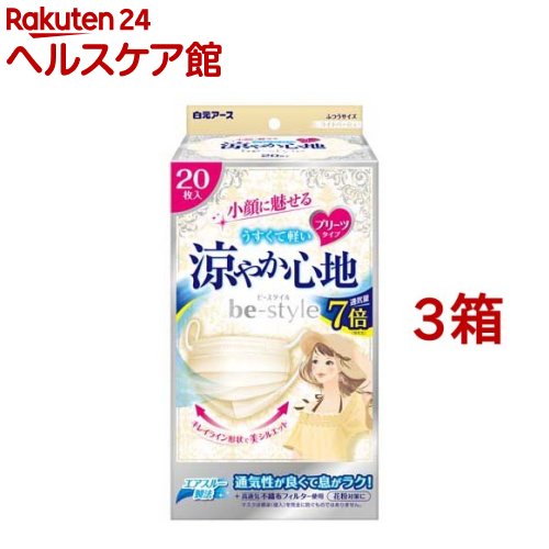 お店TOP>衛生医療>マスク>小さめマスク>女性用マスク>ビースタイル プリーツタイプ 涼やか心地 ふつうサイズ ライトベージュ (20枚入*3箱セット)【ビースタイル プリーツタイプ 涼やか心地 ふつうサイズ ライトベージュの商品詳細】●通気量7倍で息がラク(メーカー比)●ムレにくく、軽やかなつけ心地の口もと素材(エアスルー製法)●上から広がるプリーツですっきり・プリーツトップの位置が高いのですっとした鼻筋を演出。 ・プリーツがもたつかないのですっきりとした横顔に。 ●縦プリーツ&引き上げタックで美シルエット・縦プリーツと引き上げタックでシャープなアゴ先に。 ・フェイスラインに沿うことで視覚的なリフトアップ効果を実現。 ●耳が痛くないふんわり幅広耳ひも●ハートのワンポイントつき●色:ライトベージュ【使用方法】(1)マスクを袋から一枚ずつ取り出します。 (2)上下の端を軽くつまみ、プリーツを広げてください。 張り出した側が外側になります。 (3)ノーズフィッターを上にして、顔にあてながらひもを両耳にかけます。 (4)ノーズフィッターを鼻の形に合わせて、軽く押さえます。 (5)顔の大きさに合わせてマスクを広げます。 【規格概要】・素材本体・フィルタ部:ポリプロピレン、ポリエチレン、ポリエステル耳ひも部:ナイロン、ポリウレタン・サイズ90*165mm(タテ*ヨコ)【注意事項】・本品は有害な粉塵・ガス等を防ぐ目的には使用できません。 ・乳幼児の手の届くところに置かないでください。 ・皮フに異常がある場合や、異常があらわれた場合には使用を中止してください。 ・着用中、臭いで気分が悪くなった場合には使用を中止してください。 ・使いきりタイプですので洗って再利用しないでください。 汚れたら新しいものと交換してください。 ・衛生面から1日1枚のご使用をおすすめします。 ・対象用途以外に使用しないでください。 ・外箱のふたを閉めて清潔な場所に保管し、早めにご使用ください。 ・一度使用したマスクは、袋内に戻さないでください。 ・使用後は地方自治体の区分に従って捨ててください。 【原産国】中国【ブランド】ビースタイル【発売元、製造元、輸入元又は販売元】白元アース※説明文は単品の内容です。 リニューアルに伴い、パッケージ・内容等予告なく変更する場合がございます。 予めご了承ください。 ・単品JAN:4902407582348白元アース110-0015 東京都台東区東上野2-21-1403-5681-7691広告文責:楽天グループ株式会社電話:050-5577-5042[マスク/ブランド:ビースタイル/] ビースタイル プリーツタイプ 涼やか心地 ふつうサイズ ライトベージュ(20枚入*3箱セット)【ビースタイル】[マスク プリーツ 小顔 女性向け おしゃれ 不織布 夏用] 2,391 円