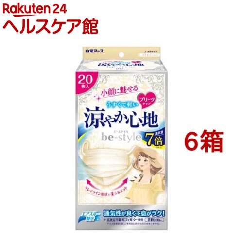 お店TOP>衛生医療>マスク>小さめマスク>女性用マスク>ビースタイル プリーツタイプ 涼やか心地 ふつうサイズ ライトベージュ (20枚入*6箱セット)【ビースタイル プリーツタイプ 涼やか心地 ふつうサイズ ライトベージュの商品詳細】●通気量7倍で息がラク(メーカー比)●ムレにくく、軽やかなつけ心地の口もと素材(エアスルー製法)●上から広がるプリーツですっきり・プリーツトップの位置が高いのですっとした鼻筋を演出。 ・プリーツがもたつかないのですっきりとした横顔に。 ●縦プリーツ&引き上げタックで美シルエット・縦プリーツと引き上げタックでシャープなアゴ先に。 ・フェイスラインに沿うことで視覚的なリフトアップ効果を実現。 ●耳が痛くないふんわり幅広耳ひも●ハートのワンポイントつき●色:ライトベージュ【使用方法】(1)マスクを袋から一枚ずつ取り出します。 (2)上下の端を軽くつまみ、プリーツを広げてください。 張り出した側が外側になります。 (3)ノーズフィッターを上にして、顔にあてながらひもを両耳にかけます。 (4)ノーズフィッターを鼻の形に合わせて、軽く押さえます。 (5)顔の大きさに合わせてマスクを広げます。 【規格概要】・素材本体・フィルタ部:ポリプロピレン、ポリエチレン、ポリエステル耳ひも部:ナイロン、ポリウレタン・サイズ90*165mm(タテ*ヨコ)【注意事項】・本品は有害な粉塵・ガス等を防ぐ目的には使用できません。 ・乳幼児の手の届くところに置かないでください。 ・皮フに異常がある場合や、異常があらわれた場合には使用を中止してください。 ・着用中、臭いで気分が悪くなった場合には使用を中止してください。 ・使いきりタイプですので洗って再利用しないでください。 汚れたら新しいものと交換してください。 ・衛生面から1日1枚のご使用をおすすめします。 ・対象用途以外に使用しないでください。 ・外箱のふたを閉めて清潔な場所に保管し、早めにご使用ください。 ・一度使用したマスクは、袋内に戻さないでください。 ・使用後は地方自治体の区分に従って捨ててください。 【原産国】中国【ブランド】ビースタイル【発売元、製造元、輸入元又は販売元】白元アース※説明文は単品の内容です。 リニューアルに伴い、パッケージ・内容等予告なく変更する場合がございます。 予めご了承ください。 ・単品JAN:4902407582348白元アース110-0015 東京都台東区東上野2-21-1403-5681-7691広告文責:楽天グループ株式会社電話:050-5577-5043[マスク/ブランド:ビースタイル/] ビースタイル プリーツタイプ 涼やか心地 ふつうサイズ ライトベージュ(20枚入*6箱セット)【ビースタイル】[マスク プリーツ 小顔 女性向け おしゃれ 不織布 夏用] 4,781 円