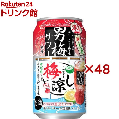 お店TOP>水・飲料>お酒>混成酒>リキュール>サッポロ 男梅サワー 梅涼し (24本入×2セット(1本350ml))【サッポロ 男梅サワー 梅涼しの商品詳細】●しっかりした梅干し感がありつつも、一口飲む度にすだちが爽やかに香る男梅サワー。 ●アルコール度数:5%【品名・名称】リキュール(発泡性)【サッポロ 男梅サワー 梅涼しの原材料】梅果汁、すだち果汁、スピリッツ(国内製造)、梅干浸漬酒、糖類/炭酸、酸味料、香料、果実色素、カラメル色素、酸化防止剤(ビタミンC)【栄養成分】100mlあたりエネルギー:43kcal、たんぱく質:0g、脂質:0g、炭水化物:3.6g(糖質:3.6g、食物繊維:0〜0.1g)、食塩相当量:0.07g【保存方法】常温【発売元、製造元、輸入元又は販売元】サッポロビール20歳未満の方は、お酒をお買い上げいただけません。 お酒は20歳になってから。 本品はメーカー製造中止のため、在庫限りで販売終了となります。 ※説明文は単品の内容です。 リニューアルに伴い、パッケージ・内容等予告なく変更する場合がございます。 予めご了承ください。 ・単品JAN:4901880932107サッポロビール150-8522 東京都渋谷区恵比寿四丁目20番1号0120-207800広告文責:楽天グループ株式会社電話:050-5577-5043[アルコール飲料] サッポロ 男梅サワー 梅涼し(24本入×2セット(1本350ml)) 9,715 円