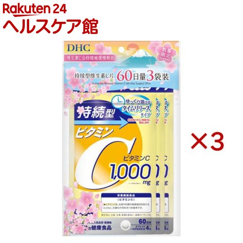 お店TOP>健康食品>ビタミン類>ビタミンC>持続型ビタミンC>持続型ビタミンC 60日分 (84.0g×3個)商品区分:栄養機能食品(栄養成分:ビタミンC)【持続型ビタミンC 60日分の商品詳細】●消耗しやすいビタミンCが「タイムリリース処方」で体内でゆっくり溶け出し、長時間とどまります。 ●1000mg(一日摂取目安量あたり)のビタミンC配合で、キレイと元気を効率よくサポートします。 【栄養成分(栄養機能食品)】ビタミンC【保健機能食品表示】ビタミンCは、皮膚や粘膜の健康維持を助けるとともに、抗酸化作用をもつ栄養素です。 【基準値に占める割合】ビタミンC:1000%【1日あたりの摂取目安量】4粒【召し上がり方】一日摂取目安量を守り、水またはぬるま湯で噛まずにそのままお召し上がりください。 【セット詳細】持続型ビタミンC 60日分 84.0g(1粒重量350mg×240粒)×3個【品名・名称】ビタミンC含有食品【持続型ビタミンC 60日分の原材料】ビタミンC、ヒドロキシプロピルメチルセルロース、セルロース、ステアリン酸Ca、微粒二酸化ケイ素【栄養成分】4粒1400mgあたり熱量:5.7kcal、たんぱく質:0g、脂質:0.05g、炭水化物:1.31g、食塩相当量:0.001g、ビタミンC: 1000mg【アレルギー物質】記載なし【保存方法】直射日光、高温多湿な場所をさけて保存してください。 【注意事項】・食生活は、主食、主菜、副菜を基本に、食事のバランスを・お身体に異常を感じた場合は、摂取を中止してください。 ・原材料をご確認の上、食物アレルギーのある方はお召し上がりにならないでください。 ・薬を服用中あるいは通院中の方、妊娠中の方は、お医者様にご相談の上お召し上がりください。 ・お子様の手の届かないところで保管してください。 ・開封後はしっかり開封口を閉め、なるべく早くお召し上がりください。 ・本品は、多量摂取により疾病が治癒したり、より健康が増進するものではありません。 一日の摂取目安量を守ってください。 ・本品は、特定保健用食品と異なり、消費者庁長官による個別審査を受けたものではありません。 【原産国】日本【ブランド】DHC【発売元、製造元、輸入元又は販売元】ディーエイチシーリニューアルに伴い、パッケージ・内容等予告なく変更する場合がございます。 予めご了承ください。 ディーエイチシー〒106-8571 東京都港区南麻布2-7-10120-333-906広告文責:楽天グループ株式会社電話:050-5577-5043[ビタミンサプリメント/ブランド:DHC/] 【企画品】持続型ビタミンC 60日分(84.0g×3個)【DHC】[DHC ビタミン セット まとめ買い] 2,300 円