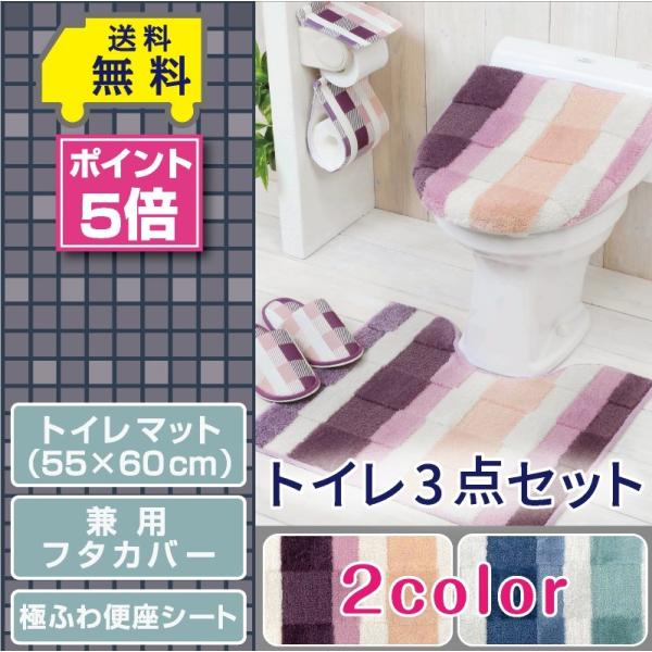 トイレ3点セット マット(55×60cm) 兼用フタカバー 極ふわ便座シート /モザイク 2色