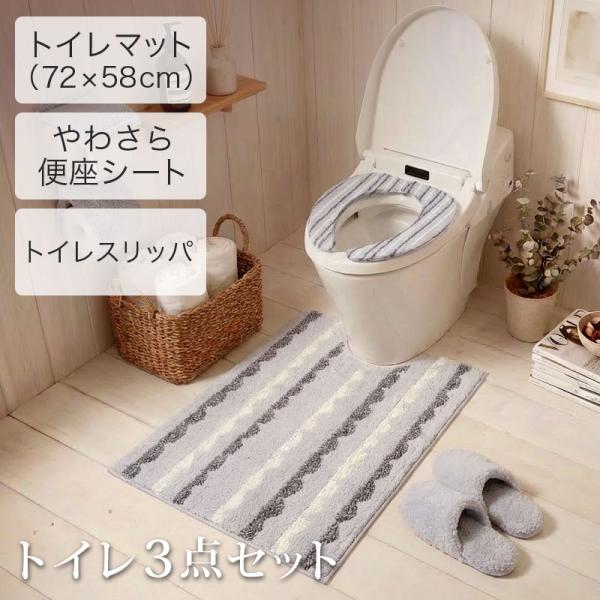 トイレ3点セット ロングマット(72×58cm) やわさら便座シート トイレスリッパ /スミカ ウエーブ グレー