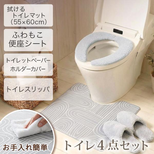 拭ける!洗濯不要 トイレ4点セット マット(55×60cm) ふわもこ便座シート ペーパーホルダーカバー トイレスリッパ /スミカ ウズマキ グレー