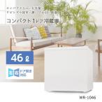左右ドア開きに対応、お部屋にあわせてドアが付け替えられる。 コンパクトなのに2Lペットボトル収納可能。 耐熱性能天板付き、電子レンジを上に置けます。 品番/品名:WR-1046/1ドア冷蔵庫 46L(WR-1046) 本体サイズ:W470×D447×H496(mm) 本体重量:約15kg 電源:100V 50/60Hz 消費電力:43W 年間消費電力量:130kWh/年 承認規格:PSE 冷却方式:直冷式 冷媒:ノンフロンR600a 定格内容積:46L コード長:約1.8m 付属品:霜取り用ヘラ、製氷皿、卵置き、棚、露受けトレイ、取扱説明書(保証書付き) ※アイスクリームや冷凍商品の保存はできません。