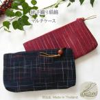 紺色の和風な絣織りコットンのマルチケース 織物の産地の東北タイにて絣布を購入して 東北タイのロイエットのバッグ工房で別注しました。 表布と裏地の間にバッグ用のしっかりした真をいれているので 作りはかなりしっかりしています。