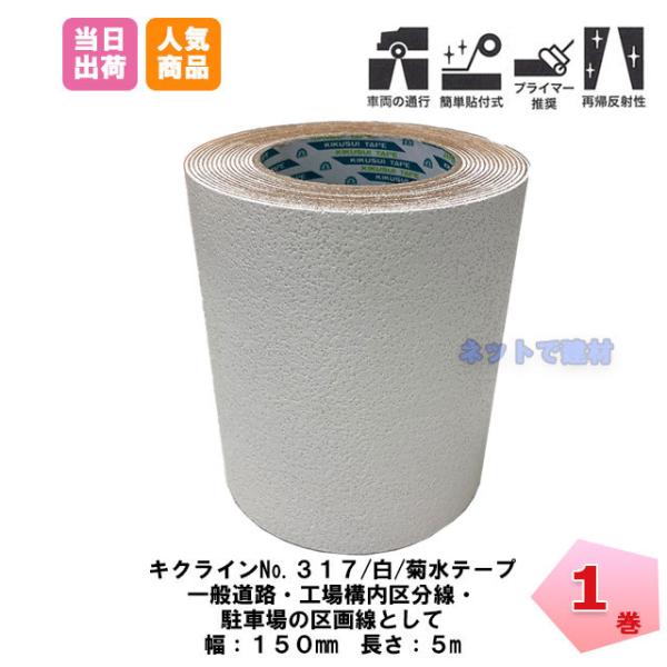 キクラインテープ No.317 白色 1巻 150mm幅×5m 菊水 合成ゴム プライマー 貼付 車両通行 反射ビーズ 道路 駐車場 ラインテープ 路面標示用