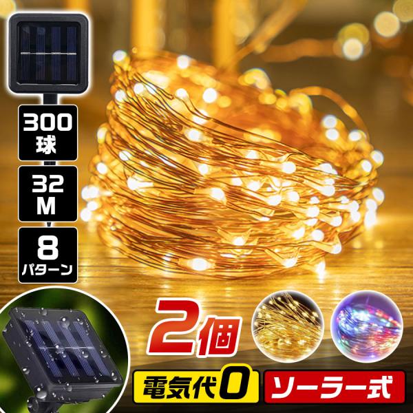 イルミネーションライト 2個セット ソーラーライト 屋外 屋内 300LED 32m 8パターン点灯 明暗センサー 自動点灯/消灯 防水 クリスマス