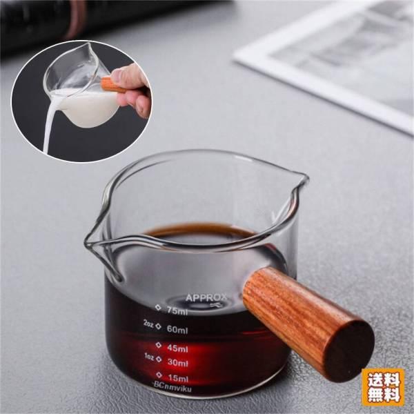 エスプレッソ計量カップ 耐熱ガラス 木製ハンドル ダブルスパウト ミルクカップ 透明 両口 グラス コーヒー計量 ミルク オンス